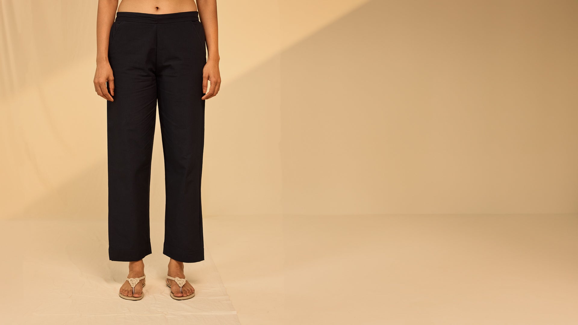 The Plain Black Cotton Straight Pant offers a sleek and timeless look. Made from soft cotton, these straight-cut pants include side pockets and a semi-elasticised waistband, providing comfort and style. A perfect staple for both casual and formal wear.