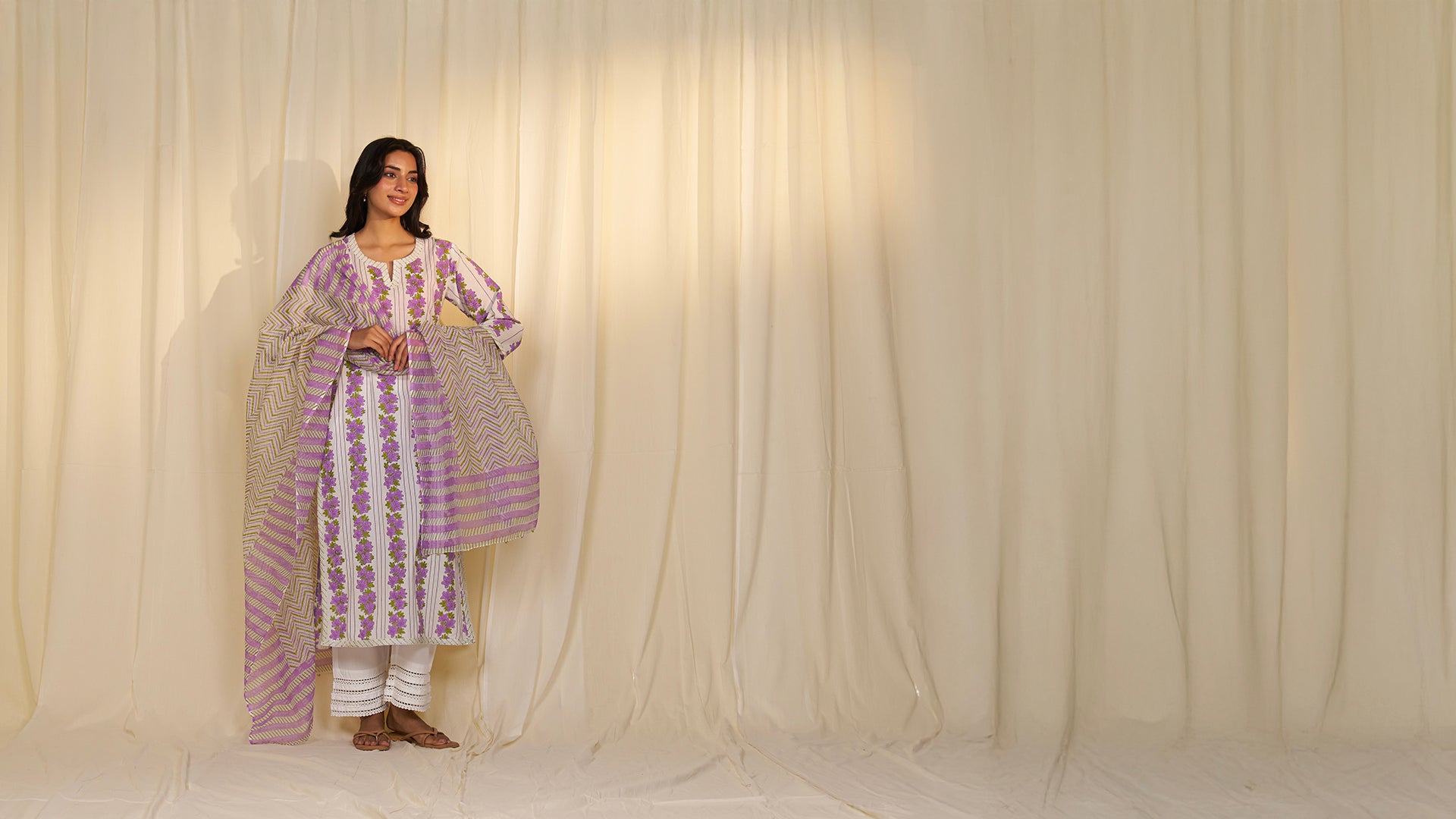 This white straight-cut kurta with hand block printed vertical rows of lavender lilies and green leaves creates a clean, elongated silhouette. Purple threadwork between the rows adds refined detail, while striped fabric with silver sequins in kantha stitch accent the sleeve hems, split round neckline, and kurta hem.