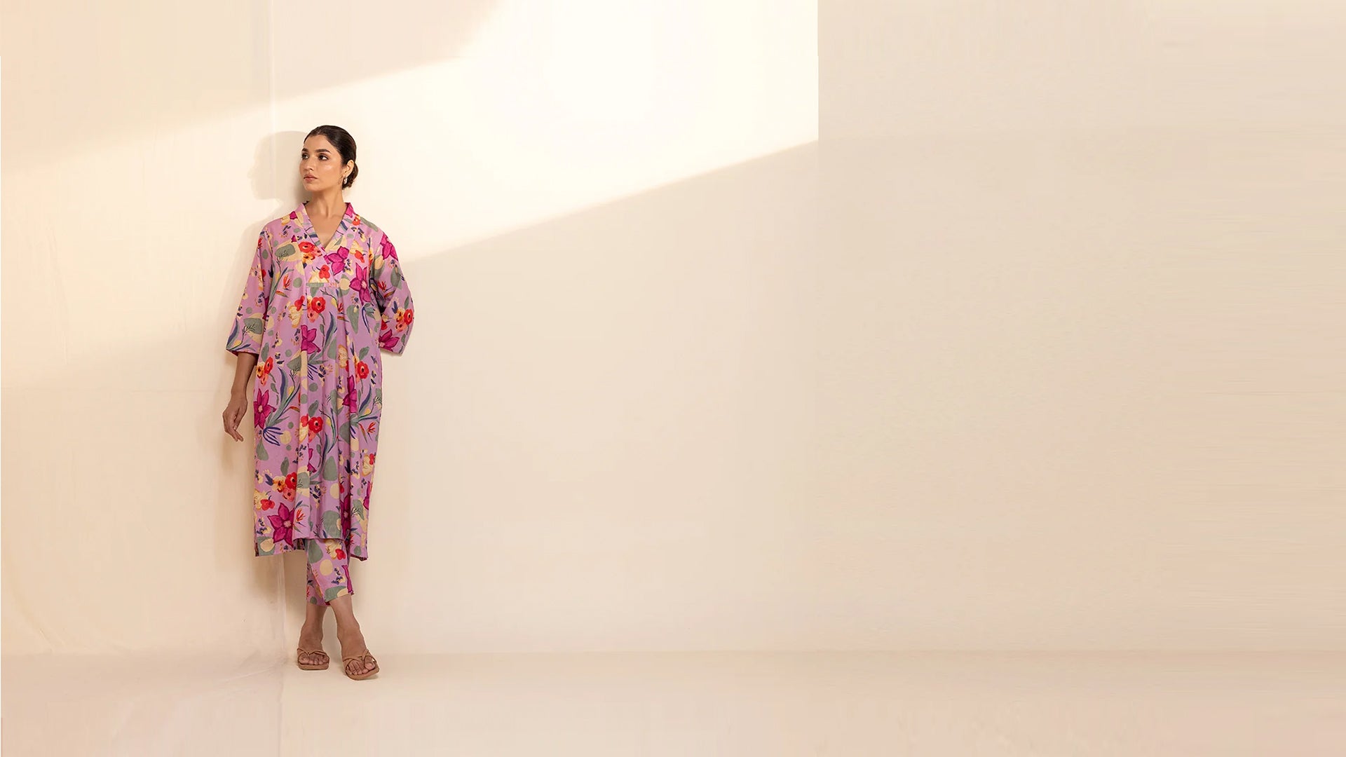 This pink cotton kurta radiates charm and romance with its vibrant floral print and unique overlapping yoke, creating a stylish collared V-neckline. Designed with a relaxed fit, pintuck detailing at the sleeve cuffs, and two convenient side pockets, it effortlessly blends elegance with comfort.