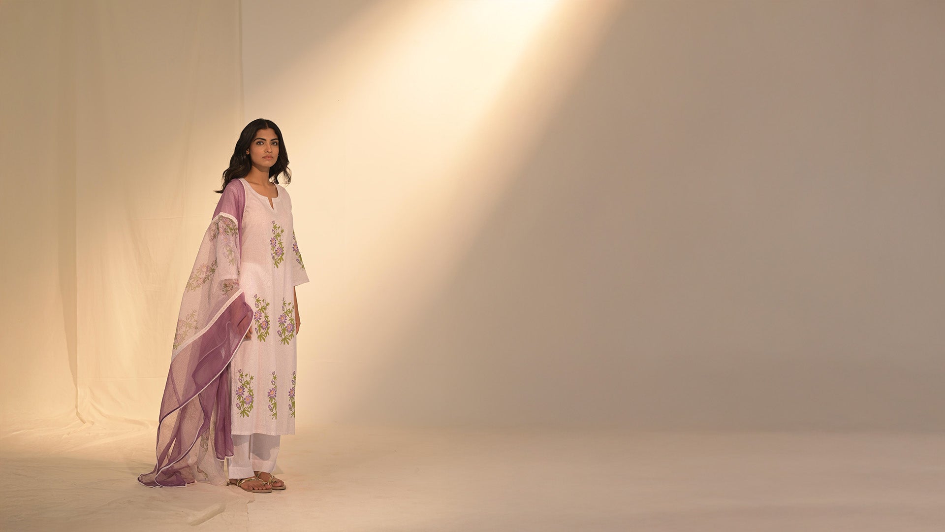 This elegant Kota Doria cotton dupatta features a soft hand-block print in beautiful purple and green floral patterns, perfectly complementing its sheer and lightweight fabric. Delicate lace embellishments along the edges add a refined and feminine touch, making this a versatile accessory for both casual and formal occasions.