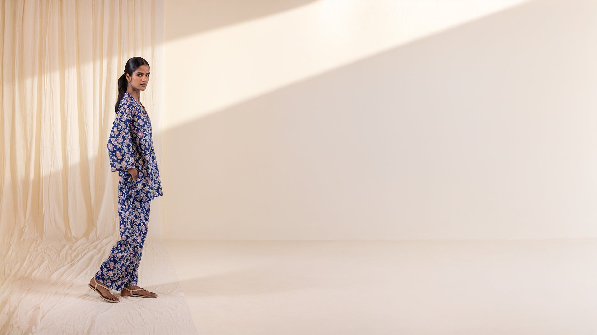 These night suits feature a half front-open collared shirt detailed with delicate shell buttons and tailored in a relaxed fit for all-night comfort. The three-fourth sleeves offer ease, while the coordinating pants come with a semi-elasticised waist, drawstring, and two side pockets for everyday practicality.