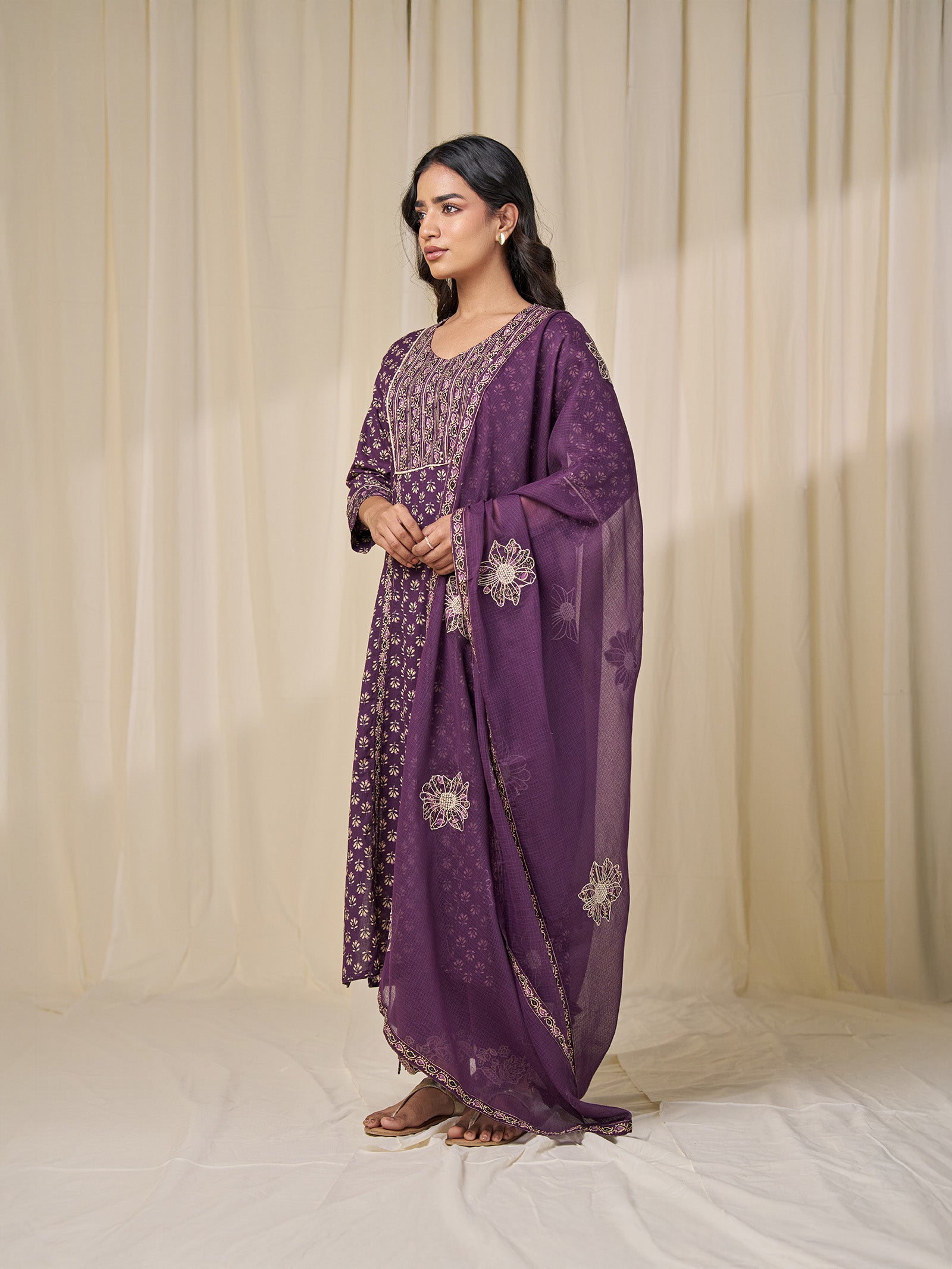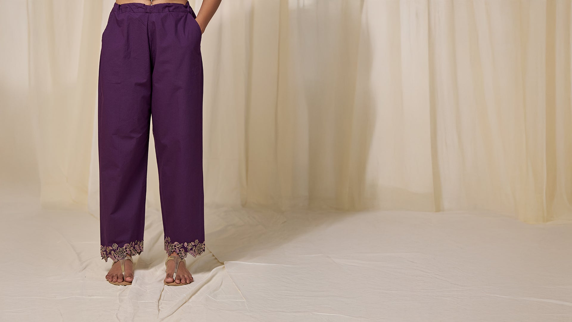The straight cut purple cotton pants feature unique floral applique cutouts at the hem. They have two side pockets and a semi-elasticised waist with drawstring for a comfort and fit.
