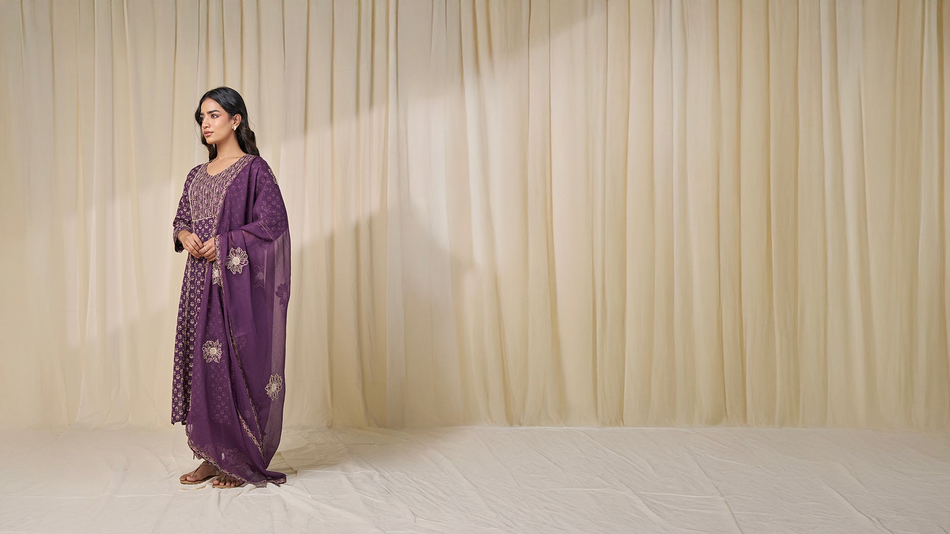 The purple kota doria dupatta has striking large floral embroidered appliques all over. It is defined and edged with hand block printed borders for a unique finish.