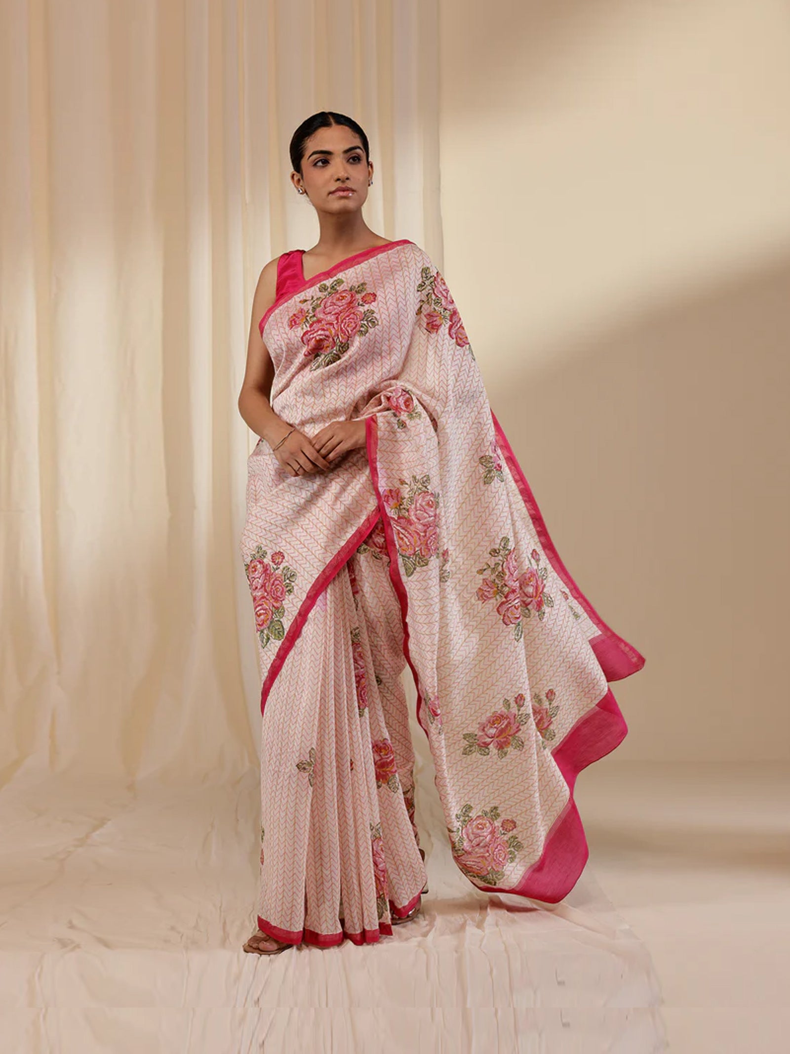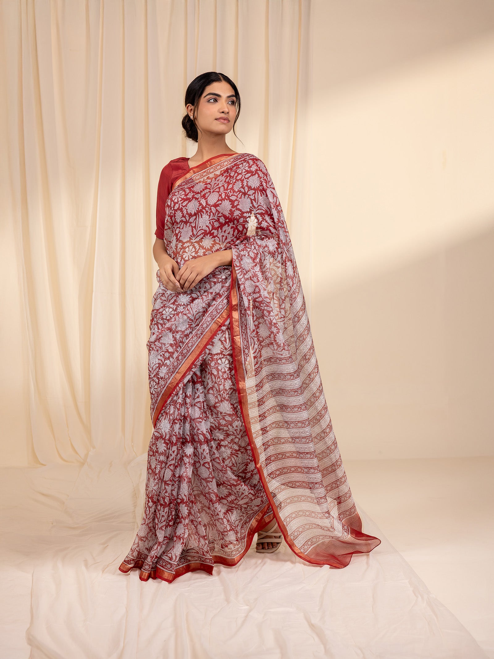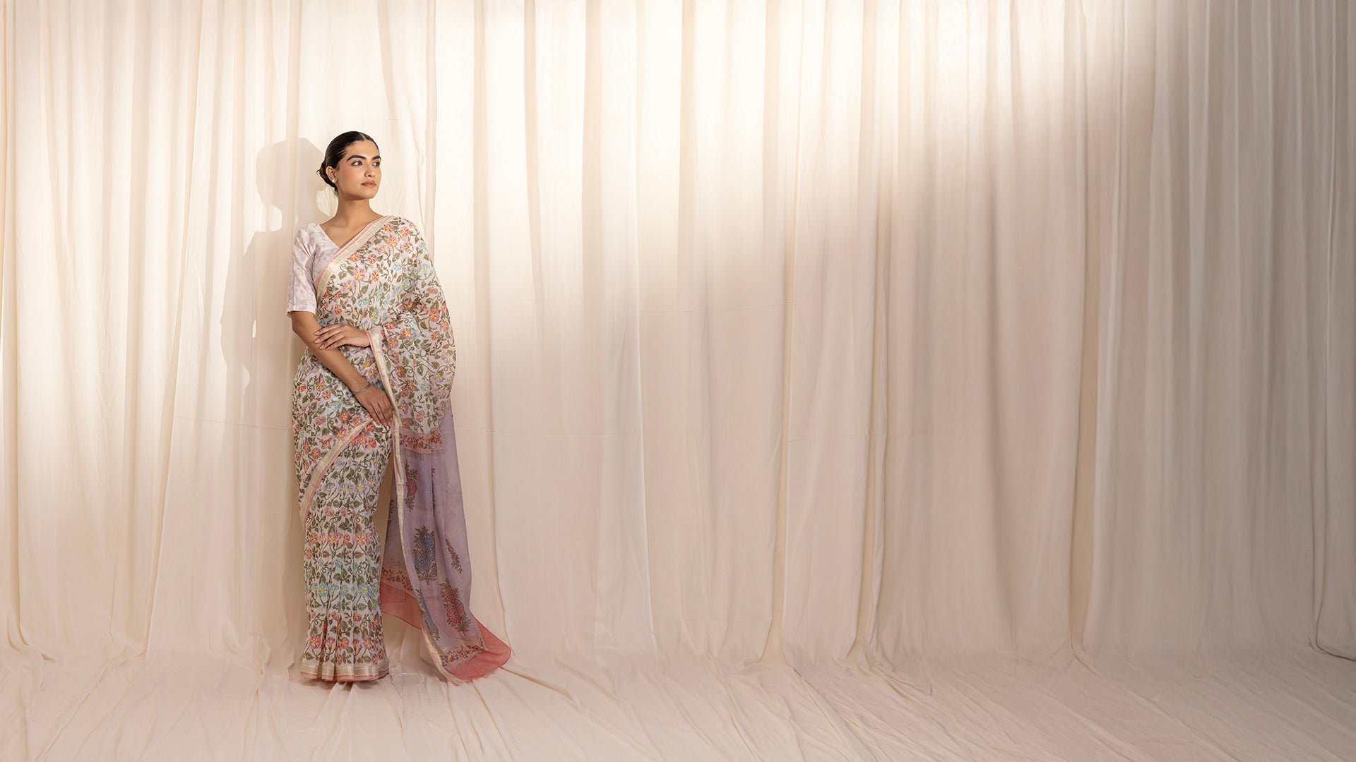 Handwoven in Maheshwar, M.P., this handwoven silk-cotton saree blends comfort with refined elegance. An allover morning-glory block print in peach, blue, lavender, green and a pop of yellow dresses the body, while the lavender palla features marigolds. Reversible gold zari borders frame the saree, enhancing its distinctive handloom charm.