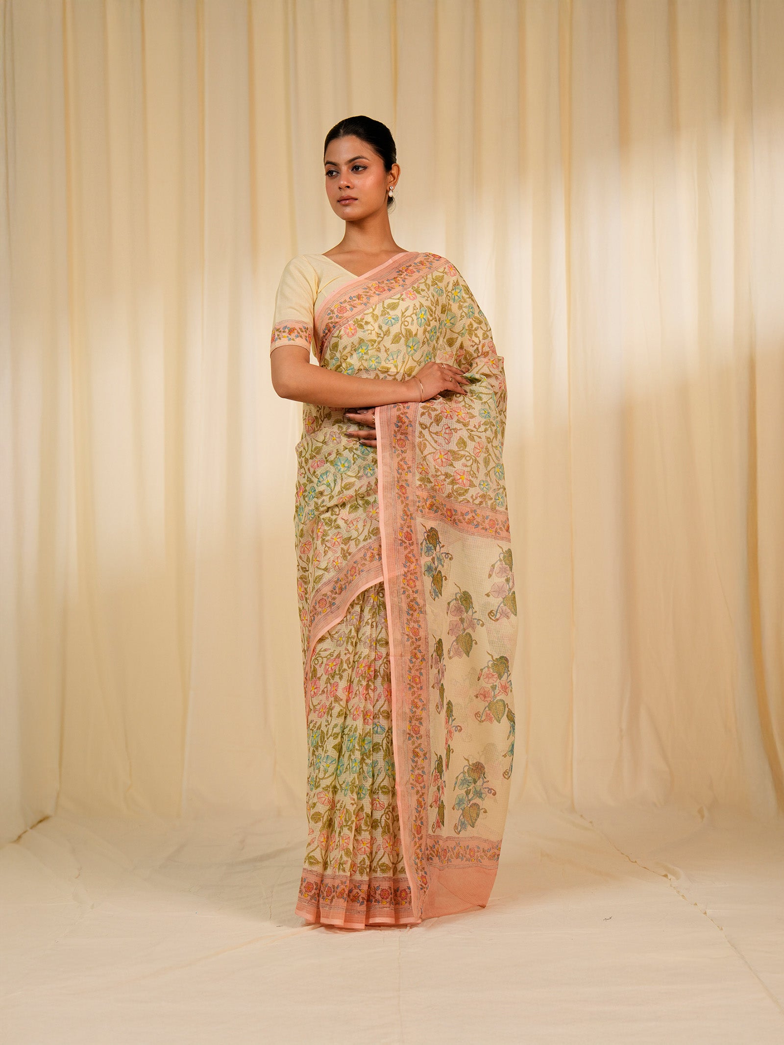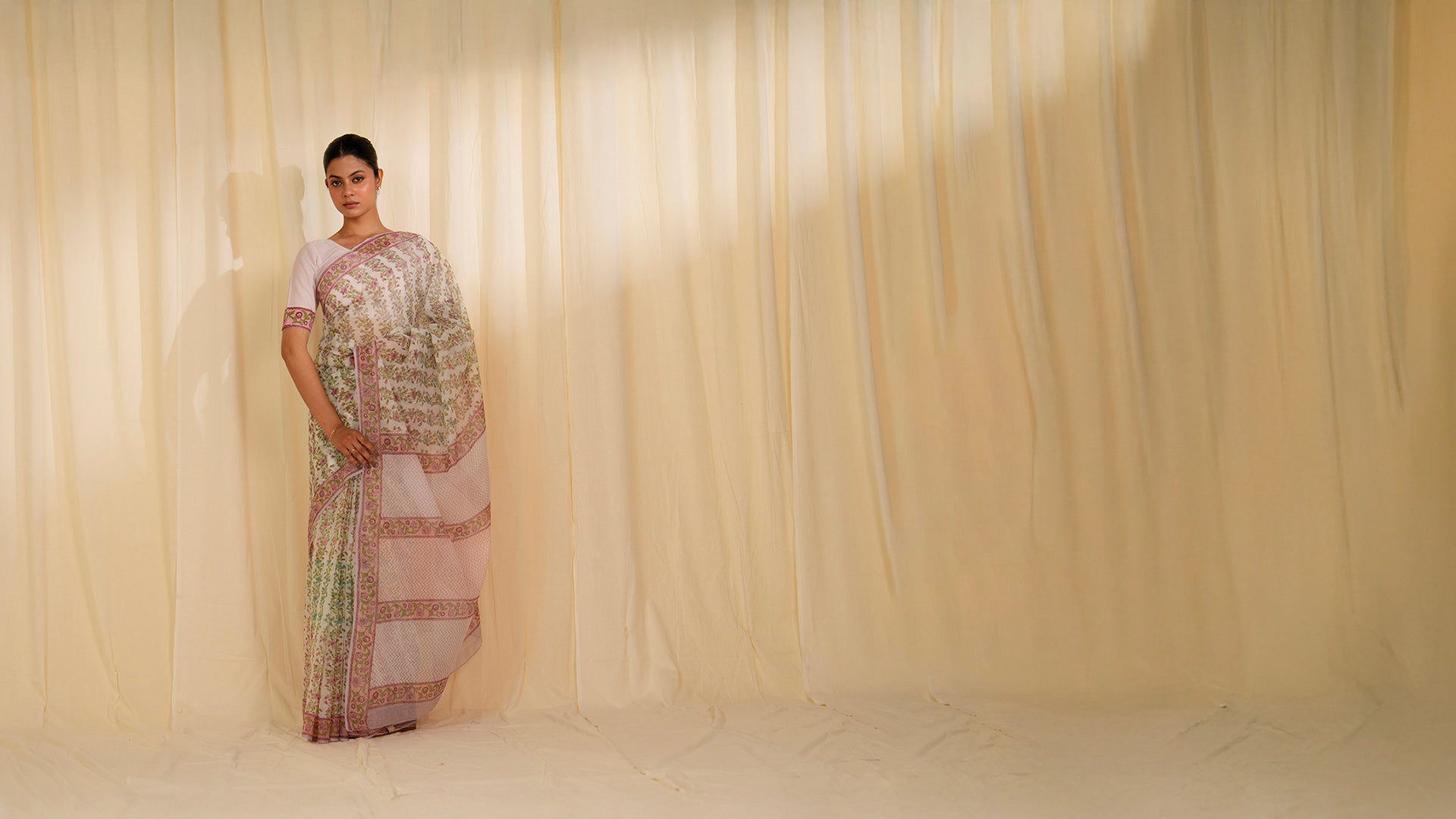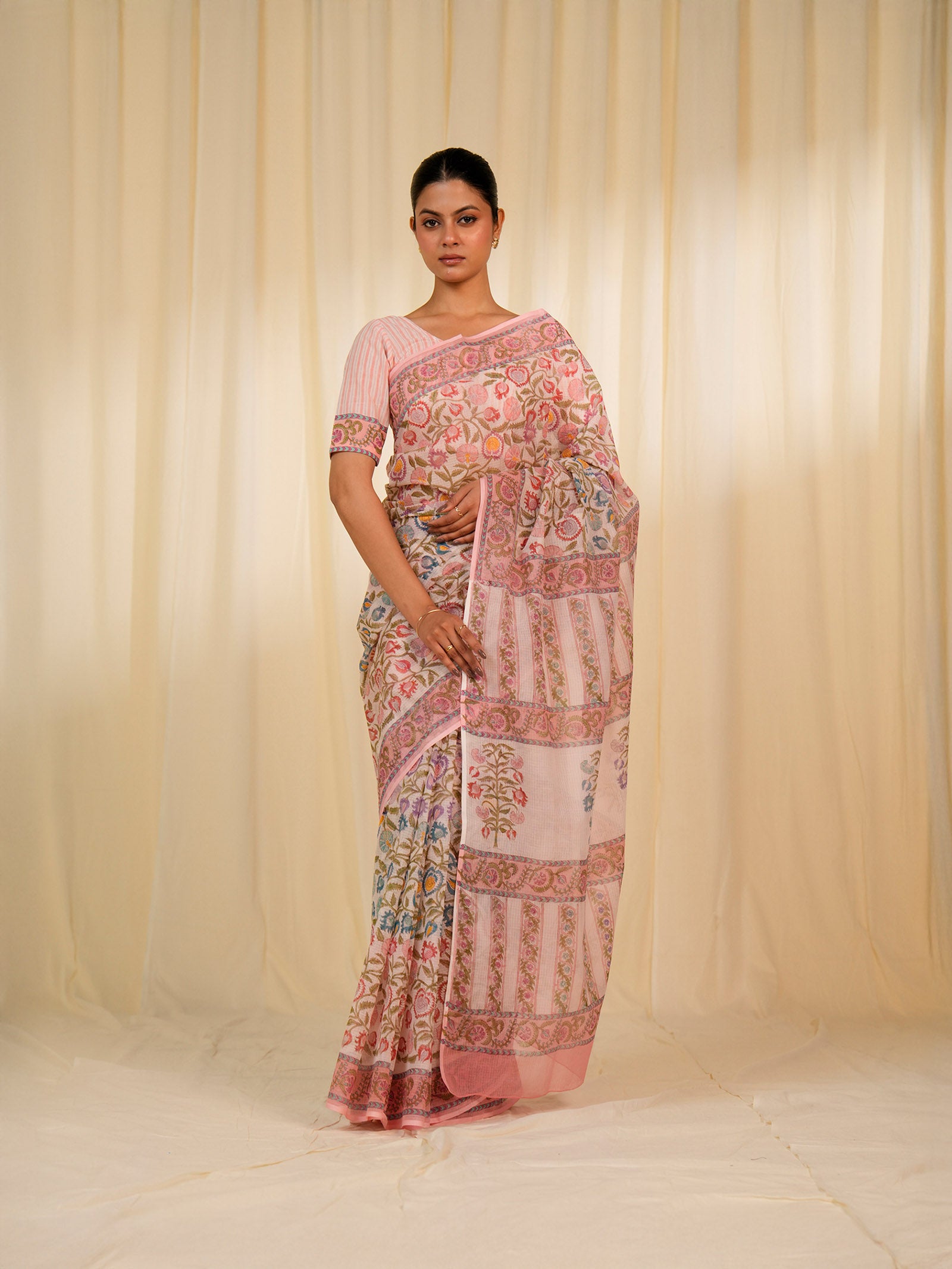 This cream Kota doria saree is hand block printed with lush floral vines arranged in alternating multicolour bands. Roses bloom in shades of pink, red, purple, and blue on green vines. The palla features a chevron pattern interrupted by floral stripes, which match the saree borders. It comes with an attached plain dobby cotton blouse with floral borders.