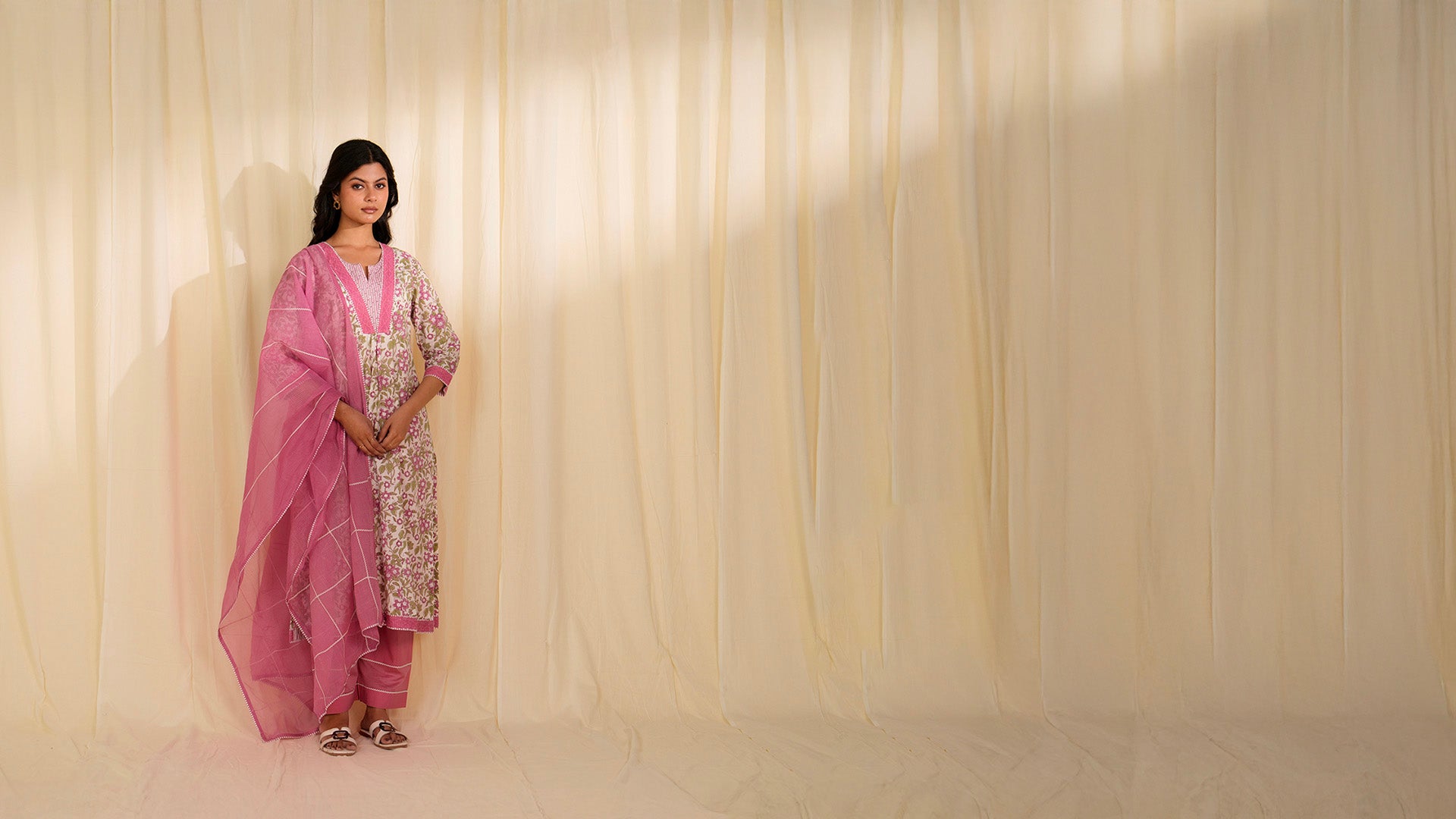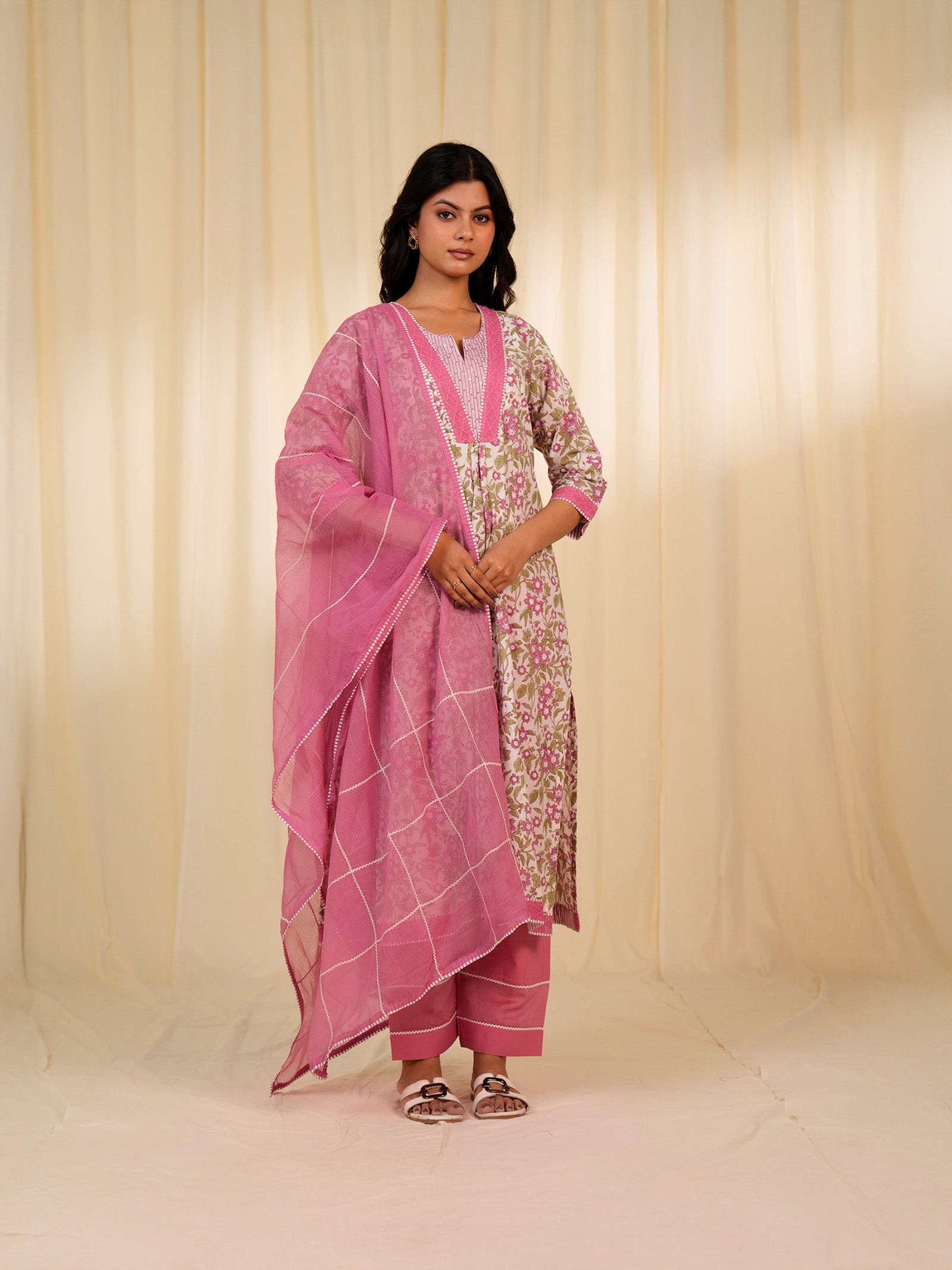 This white cotton kurta is hand-block printed with dusty pink florals and green leaves. It is tailored in a panelled A-line silhouette with a gathered central panel beneath a V-shaped yoke. Further detailed with lace, striped piping, and a round neckline with silver sequins in kantha work. It is finished with crochet lace and striped piping on the 3/4 sleeves and hem.