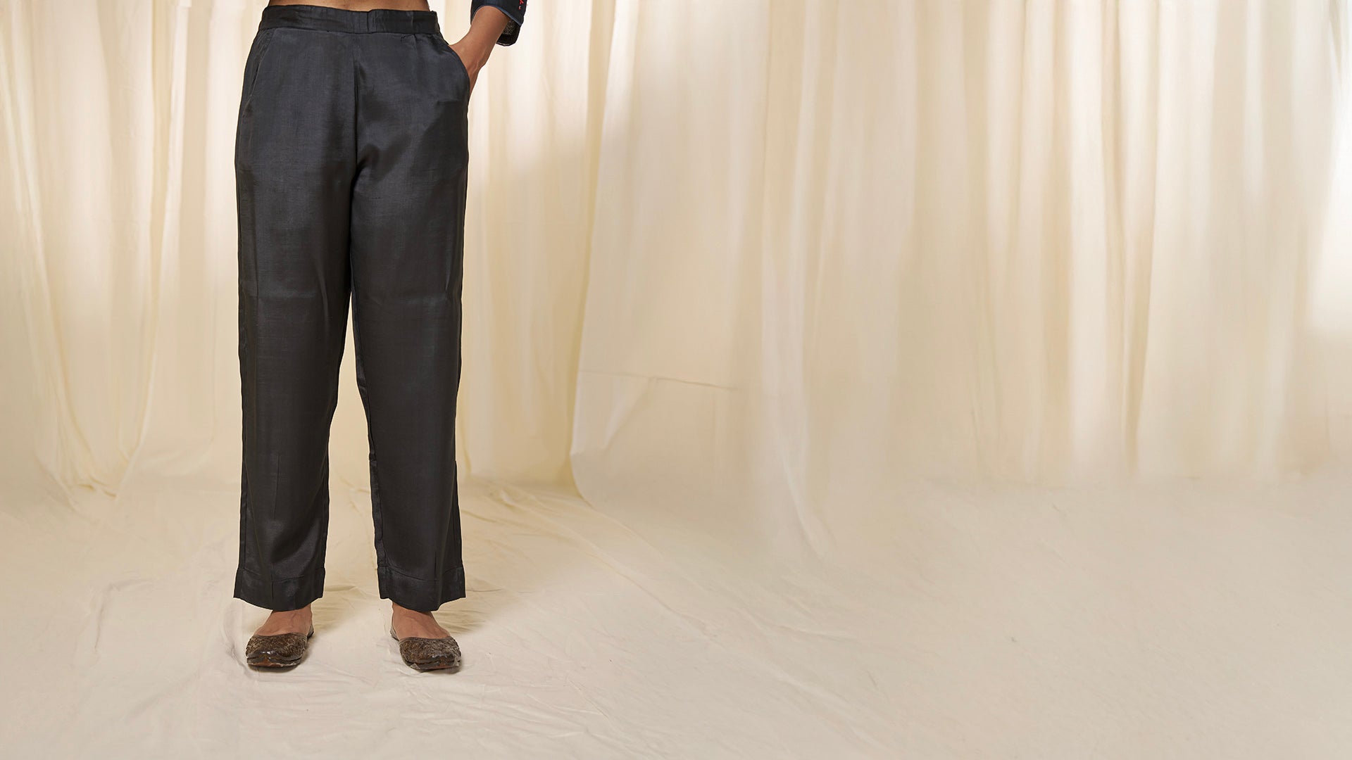 These charcoal black bamboo-silk straight pants offer a semi-elasticised waist with drawstring ensuring comfort, while two side pockets add practicality.