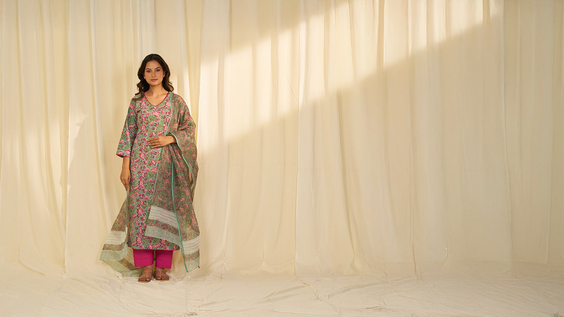 This straight-cut cotton kurta is hand block printed with a dense spread of blooming flowers and leafy vines in shades of rani pink and peach, set against a fresh aqua green base. It is designed with a rounded V neckline and three-quarter sleeves. All hems are finished with rani pink piping for a defined look.