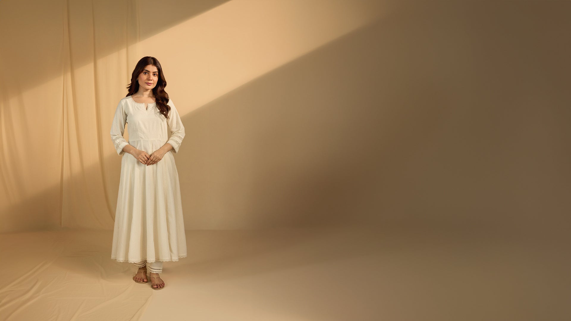 The Raw Ecru Flared Cotton Kurta offers timeless elegance with its textured dobby fabric and classic tiny checks pattern. Featuring a straight-cut bodice that flares from the waist, this kurta is accented with crocheted lace for a touch of refinement. Pair it with an embellished drape or a hand-blocked Kota Doria dupatta for a complete look.