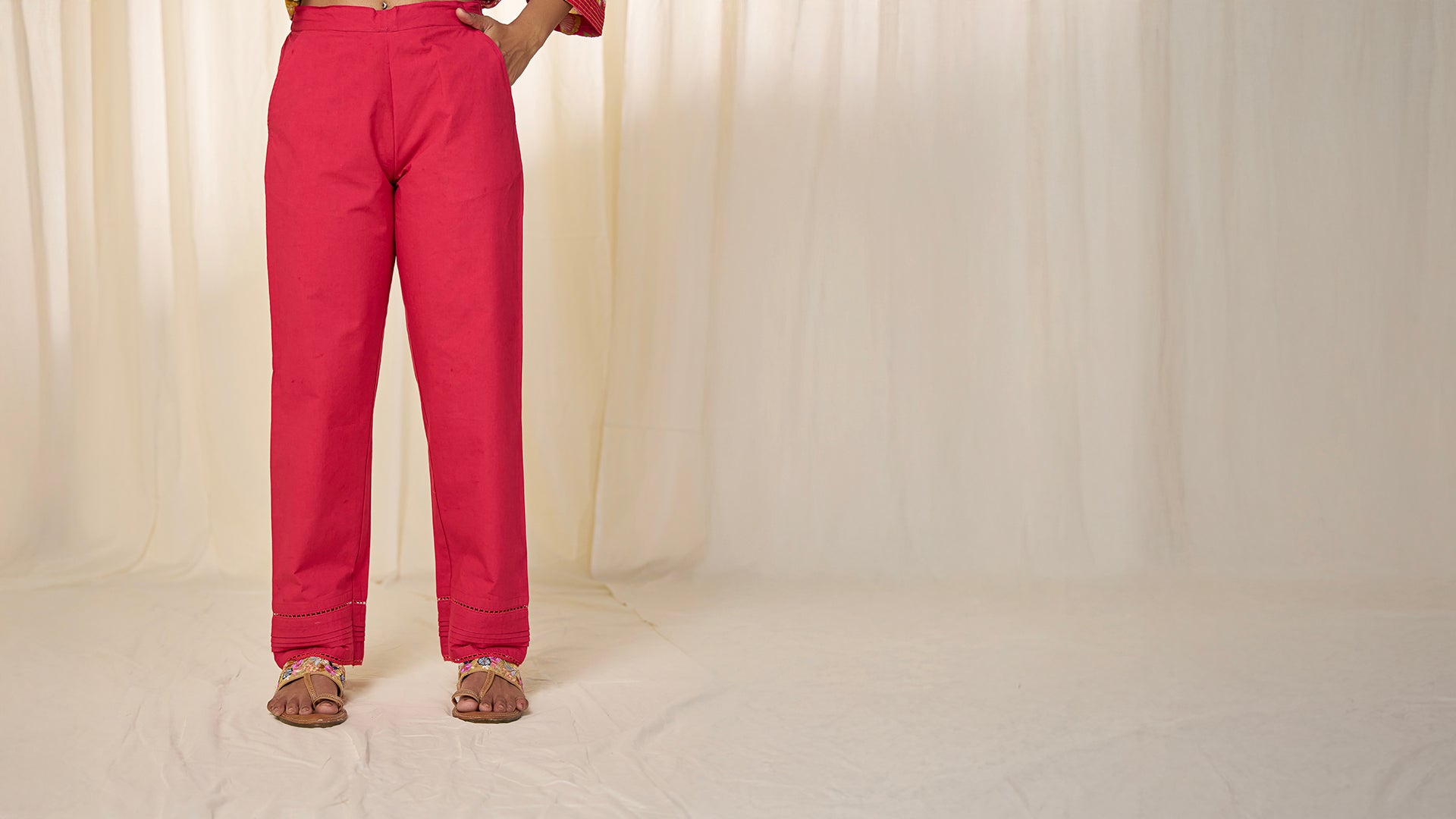 These dark rose pink straight cotton pants feature pleat and crochet lace detailing near the hems. They also boost two side pockets and a semi-elasticated waistband for practicality and comfort.
