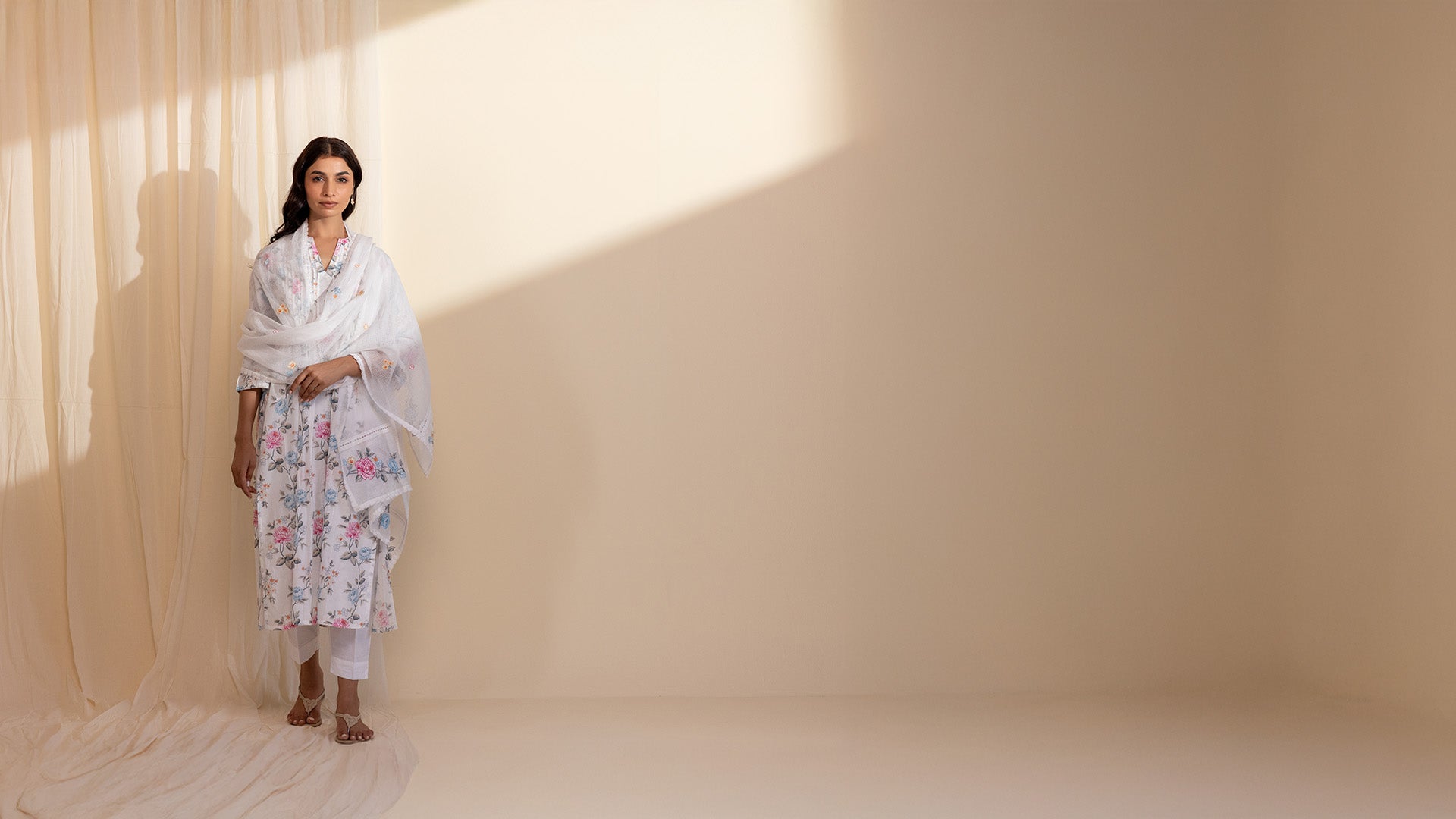 This pure white Kota Doria dupatta is a delicate blend of elegance and craftsmanship. Edged with fine scalloped lace, it features chanderi panel inserts near the ends, adorned with rose vine appliqués. Scattered floral appliqués in cheerful colours complete the look with subtle charm.