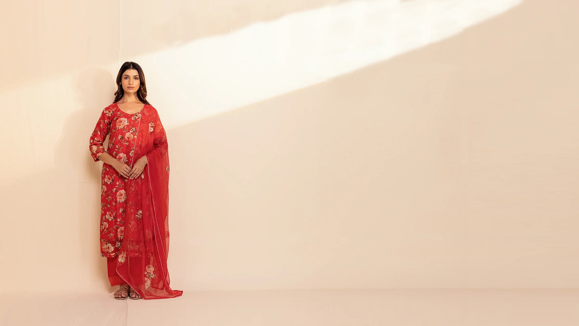 This scarlet red Chanderi kurta, with an all-over rose print, is a masterpiece of elegance and artistry. The organza detailing at the sleeve cuffs and kurta flare, adorned with intricate appliqués and embroidery, adds a unique and luxurious touch. Lined with voile, it features a modified V-neckline, 3/4th sleeves and a straight cut, making it a stunning choice for any occasion.