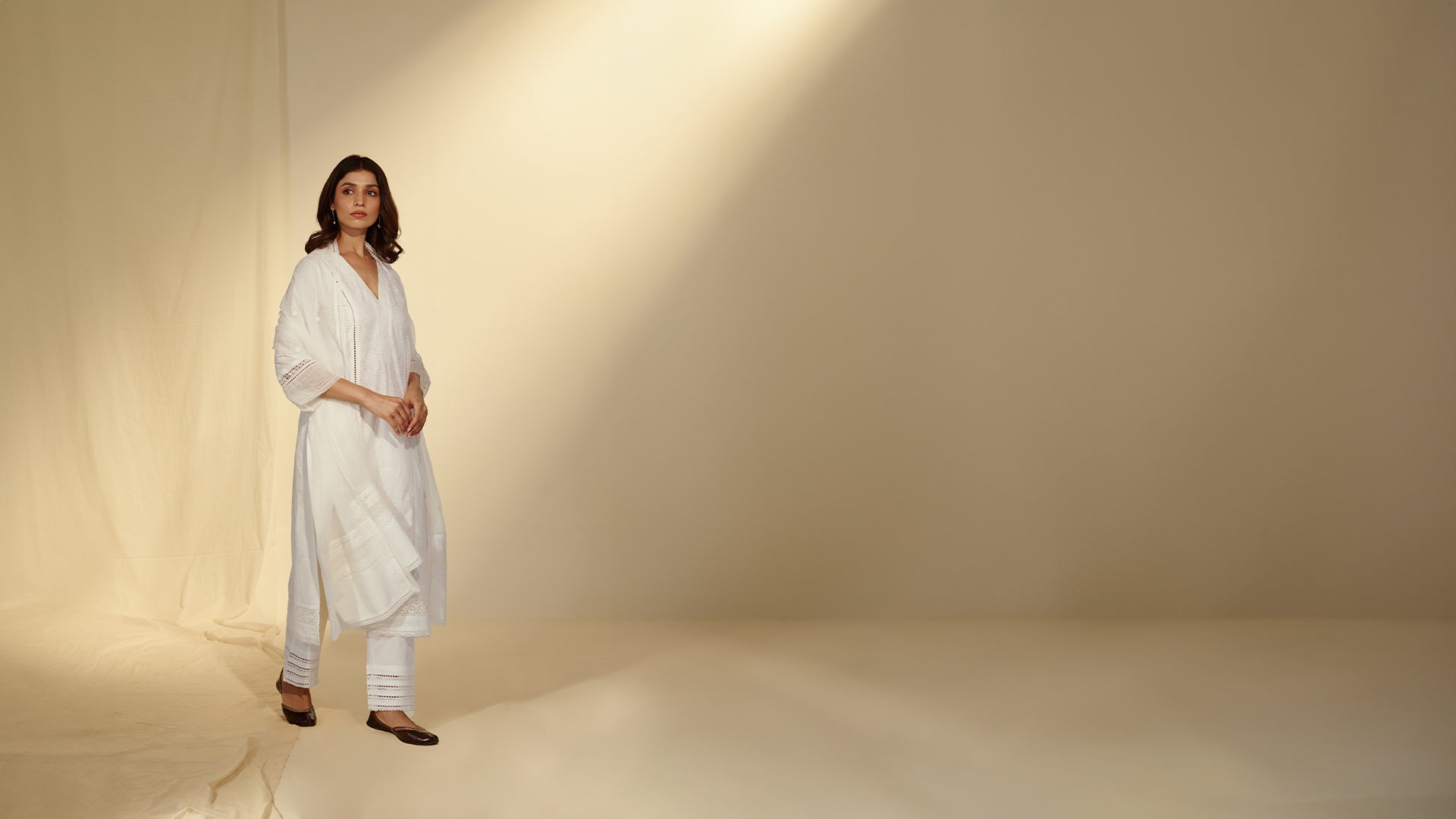 The Roses In White Cotton Kurta features a delicate white-on-white rose print with crocheted lace, sheer organza pleats, and pearl details on the sleeves. This versatile kurta exudes elegance, perfect for any occasion.