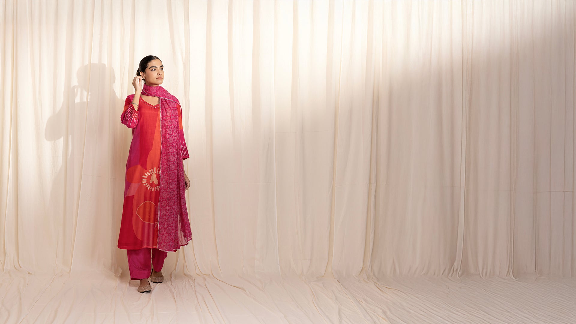 This vibrant Chanderi kurta features bold digital prints in striking shades of red, pink, and orange. Embellished with delicate sequins along the neckline and sleeves, it exudes festive charm. The kurta showcases floral motifs and a flattering straight silhouette with 3/4th sleeves, combining elegance with comfort.
