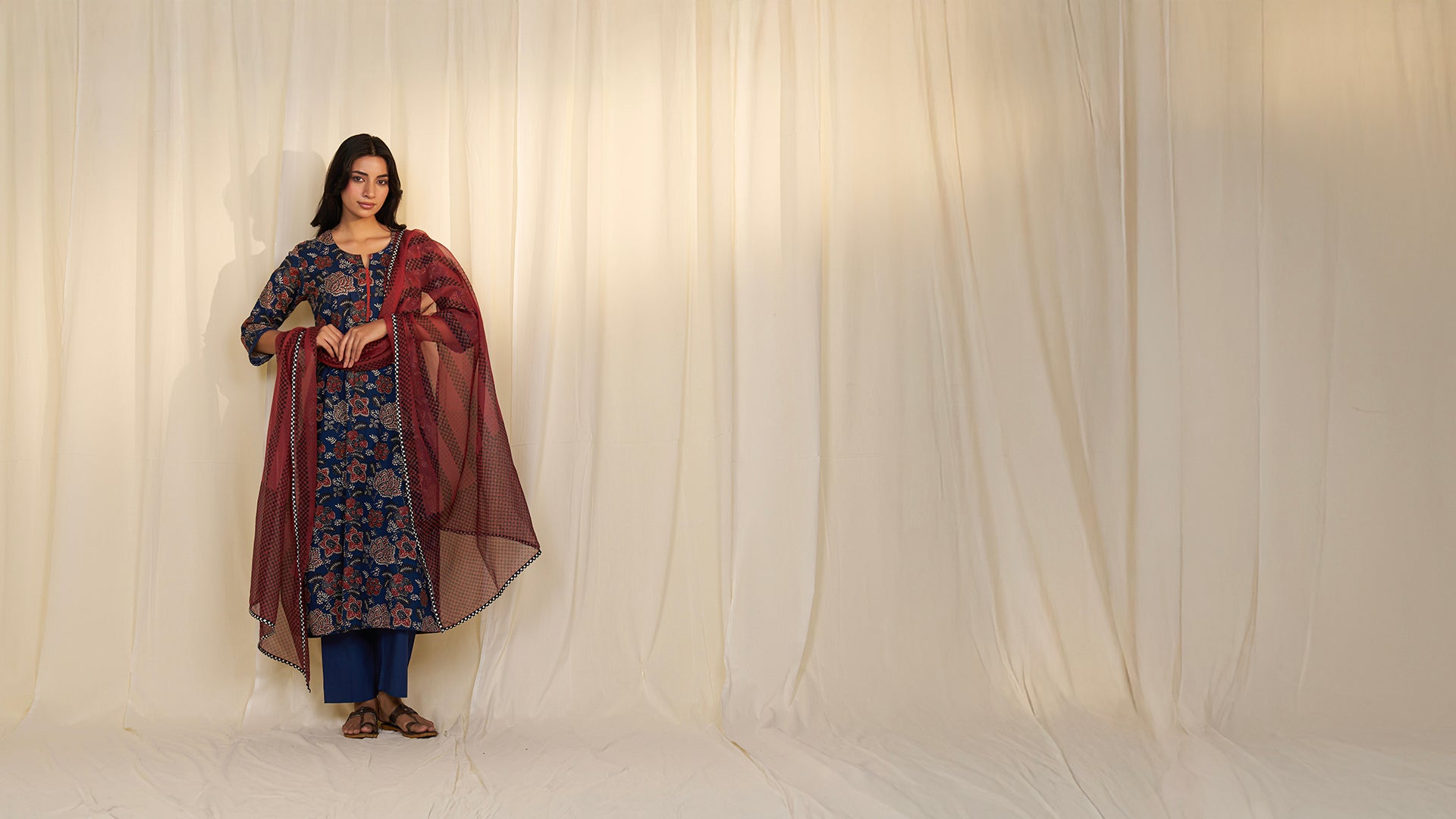 This straight-cut cotton twill kurta features a hand-printed Ajrakh-inspired motif in navy blue, terracotta, beige, and black with traditional floral designs. Red crochet lace embellishes the front placket under the split round neckline. Dark blue lace trims the three-quarter sleeves for refined detailing.