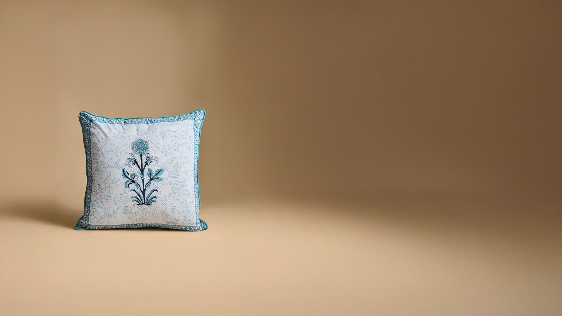These large cushion covers showcase exquisite hand block printing. The front combines a kantha-inspired floral print with a striking Mughal floral motif, creating layered elegance. The reverse side reveals a Chintz-inspired design of delicate blossoms. Finished with piping along the edges and a secure zipper closure. Does not include fillers. Fillers are available separately.