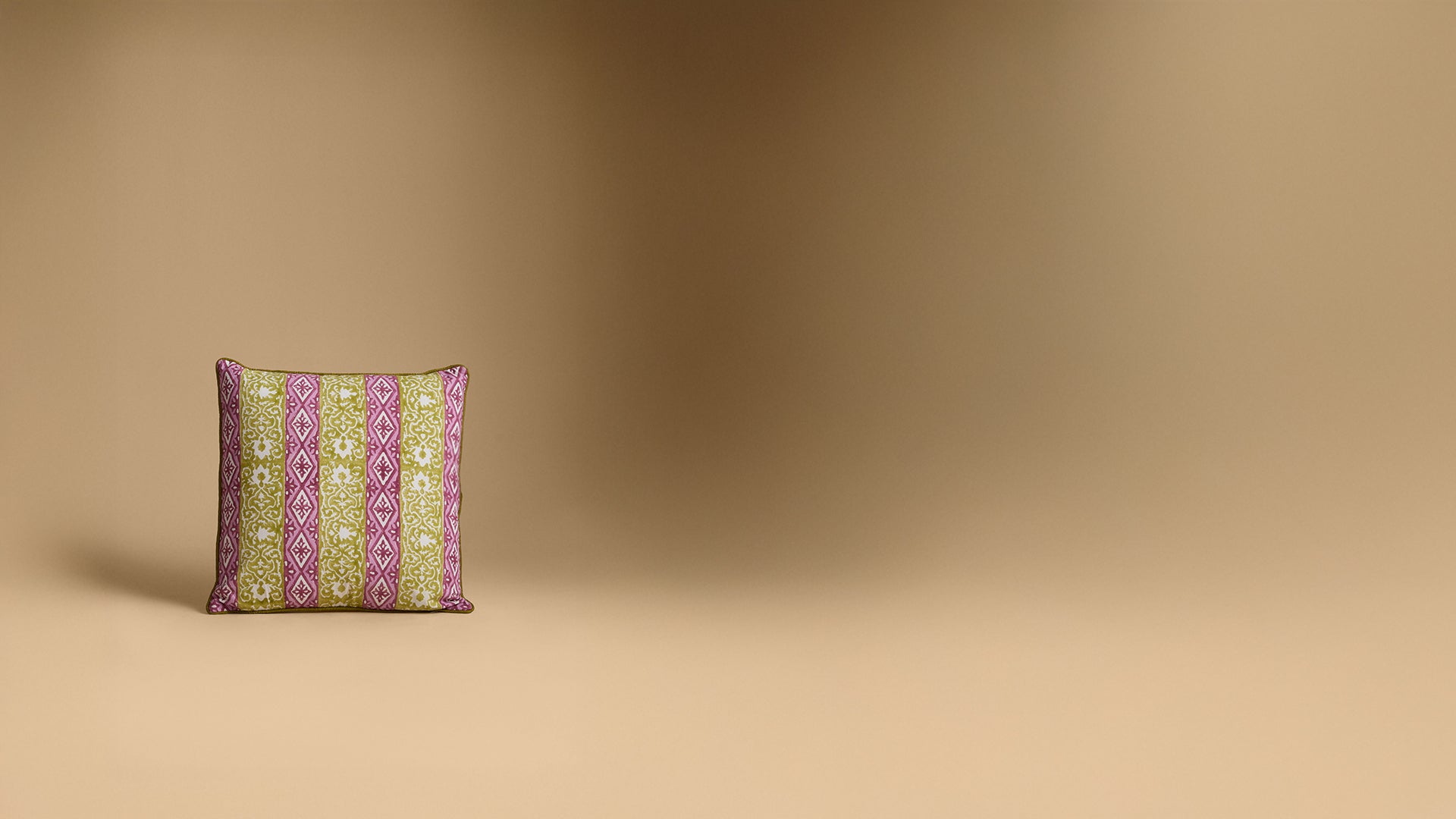In shades of mauve and green, this reversible cushion cover is printed with alternating stripes—one Mughal-inspired, the other a floral geometric design. The reverse side features thin stripes in matching alternating hues for a subtle contrast. Finished with piping along the edges and a zipper closure. Fillers are sold separately.