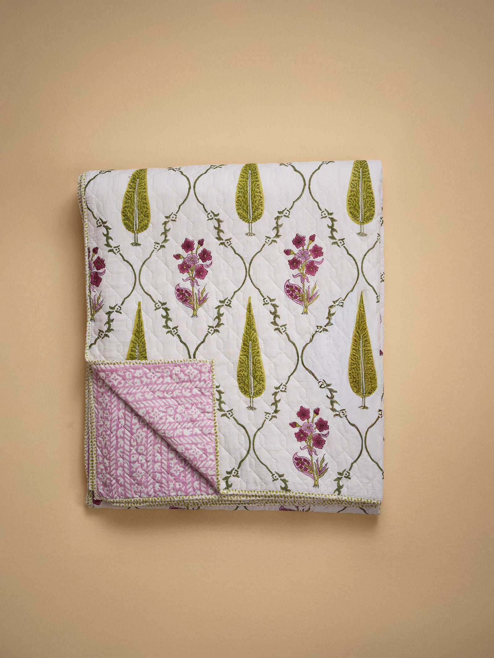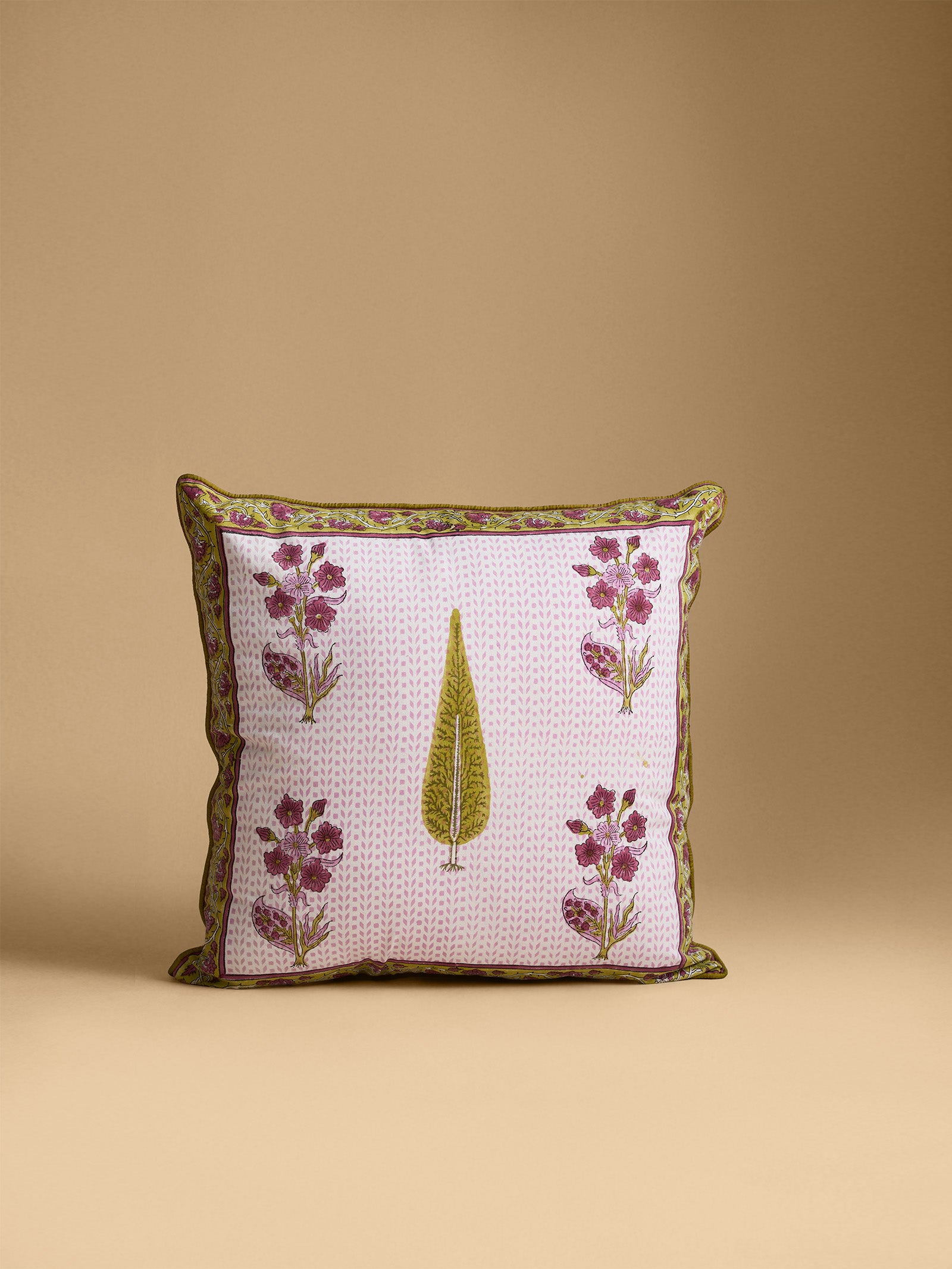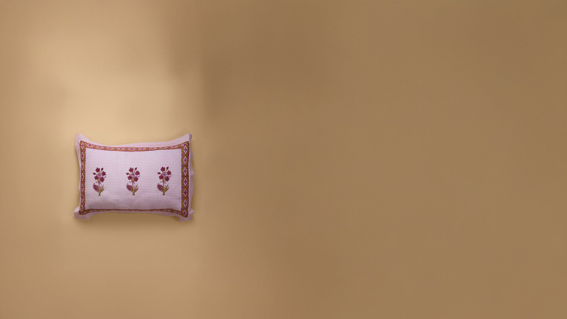 These pillow cases feature a light all over floral print on the front and back. The front is adorned with a floral geometric border and three large Mughal-inspired floral motifs at the centre. Sold as a set of two. Fillers are sold separately.