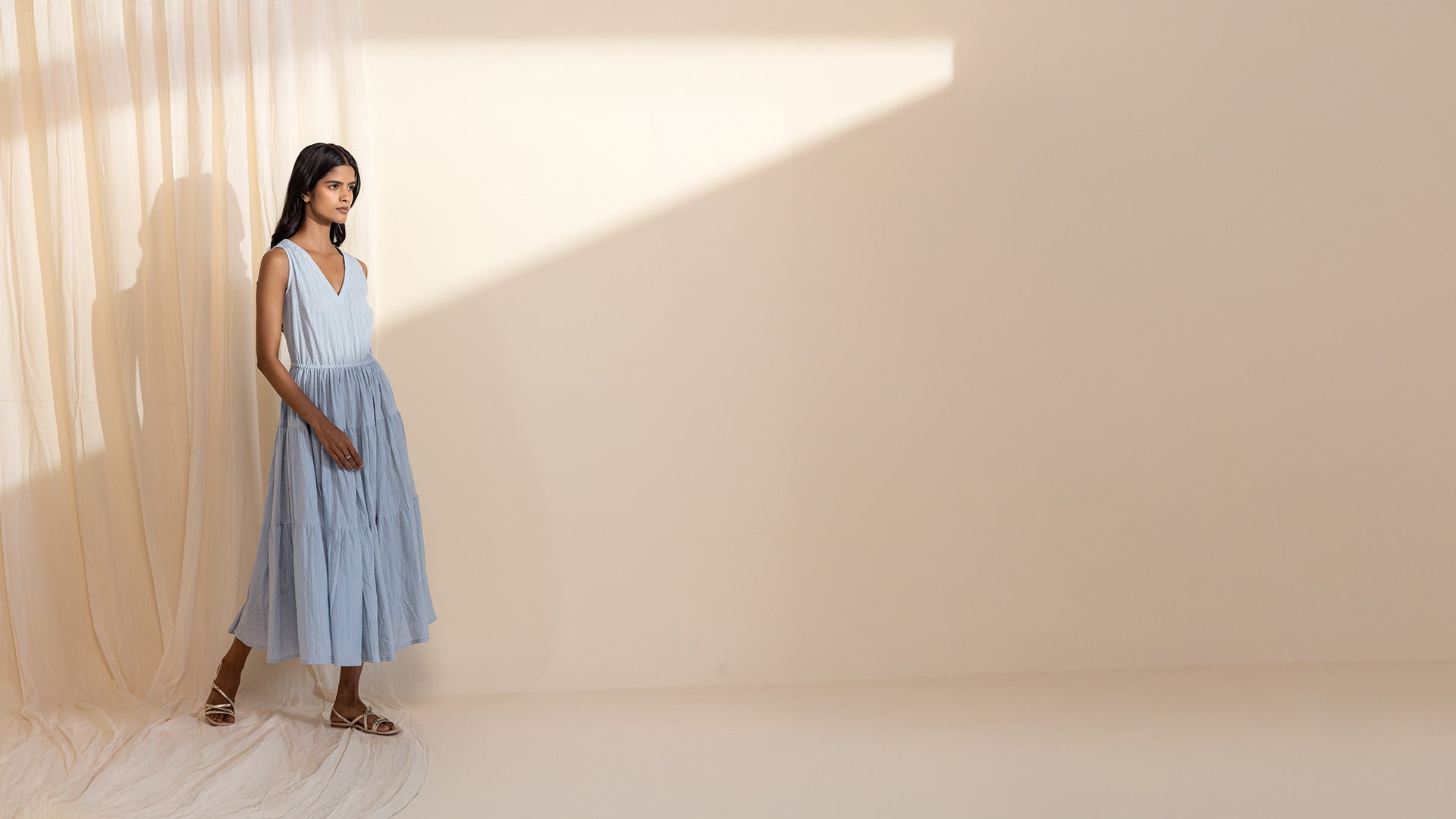 Crafted from airy seersucker cotton in a soft pale blue, this sleeveless dress is perfect for warm days. It features a flattering fit and flare silhouette with gentle gathers at the elasticated shoulders and waist. A tiered skirt adds playful volume, while the fabric’s subtle self-pattern lends a touch of effortless chic.