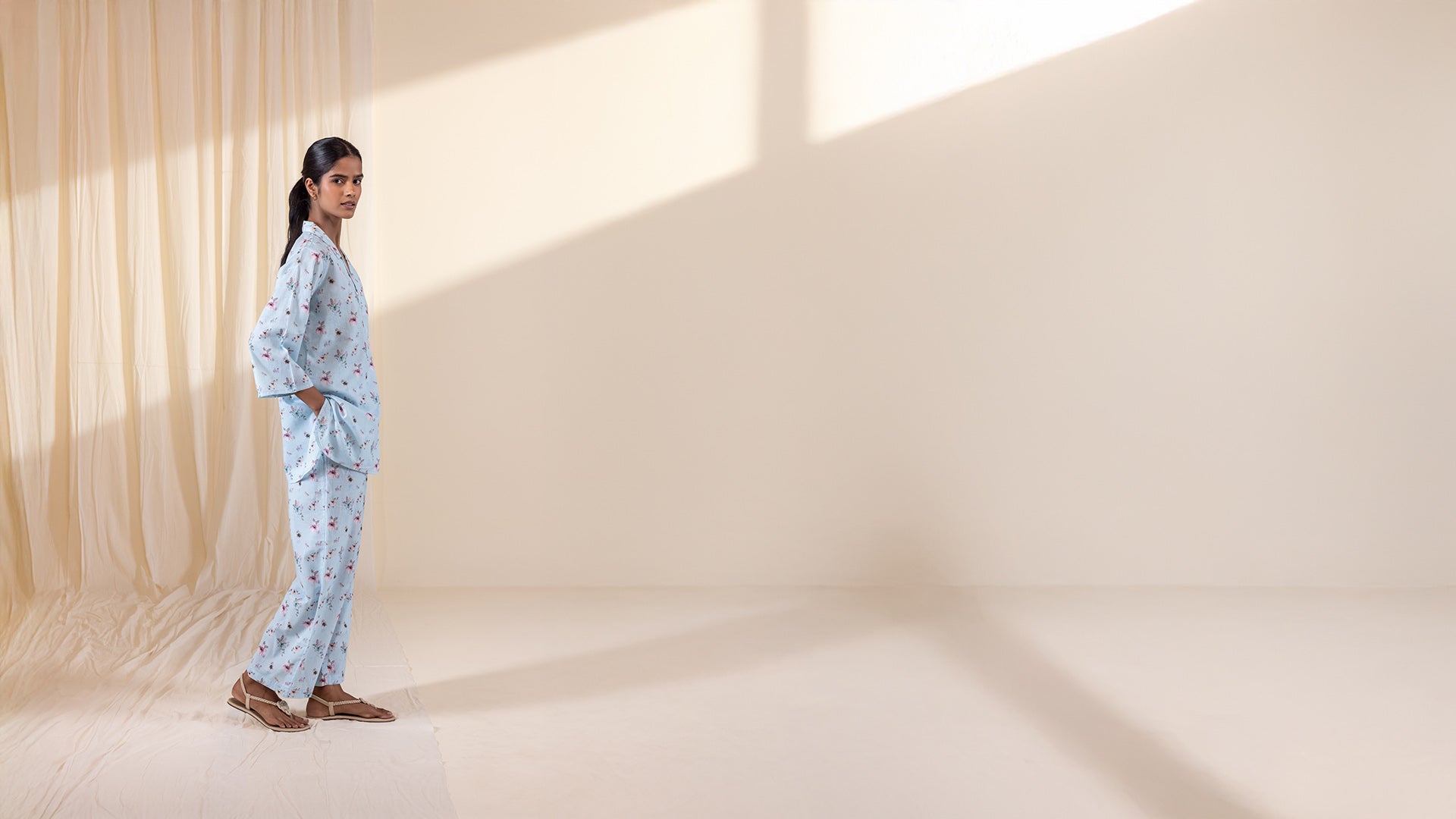 These night suits feature a half front-open collared shirt detailed with delicate shell buttons and tailored in a relaxed fit for all-night comfort. The three-fourth sleeves offer ease, while the coordinating pants come with a semi-elasticised waist, drawstring, and two side pockets for everyday practicality.