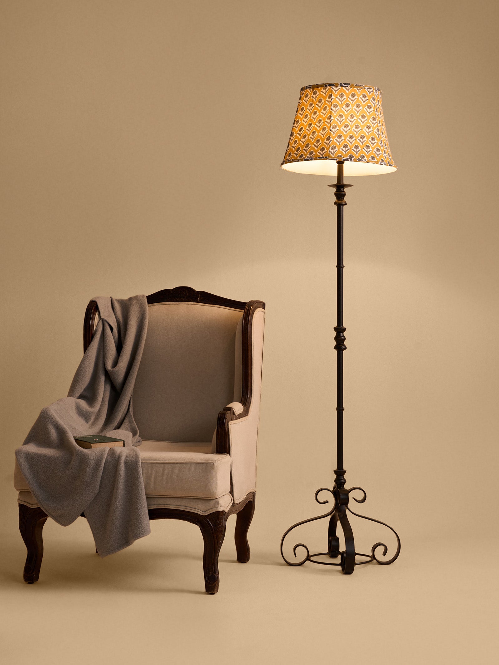 This tall wrought iron lampstand exudes timeless elegance with its sleek, slender silhouette and minimalistic design. Crafted with substantial detailing and traditional styling, it rests on a weighted base for sturdiness. Perfect for large spaces such as living rooms, lounges, or offices. Lampshades are sold separately.