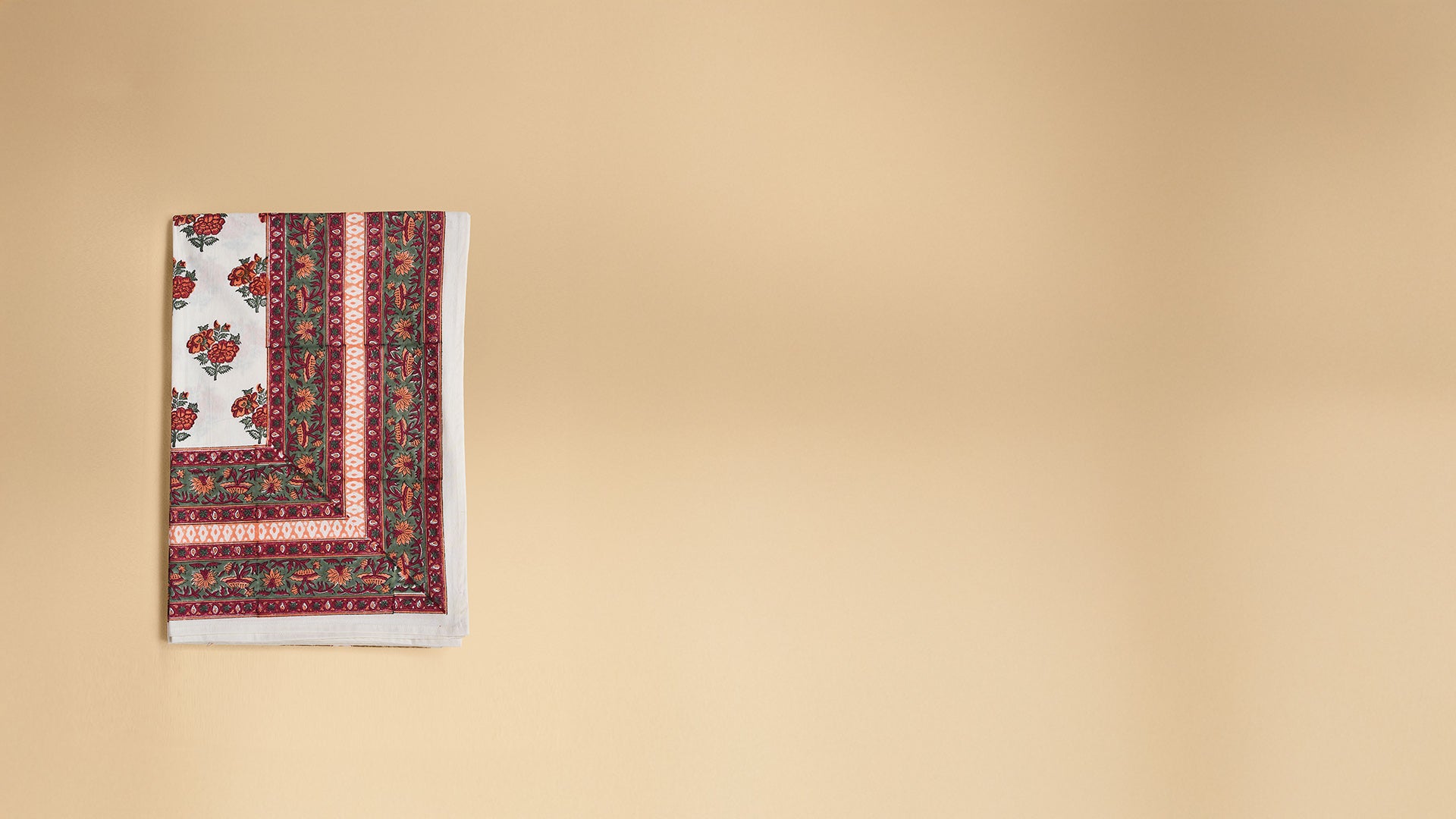 This exquisite table cover showcases a pristine off-white base adorned with evenly spaced marigold flowers, bringing warmth and vibrancy to your dining space. It is framed by intricate floral borders in rich hues of red, orange, and sage green, which elegantly enclose the central motif. Between these borders lies a delicate, abstract diamond-like pattern that gracefully separates and enhances the layered design, all crafted with meticulous hand-block printing artistry.