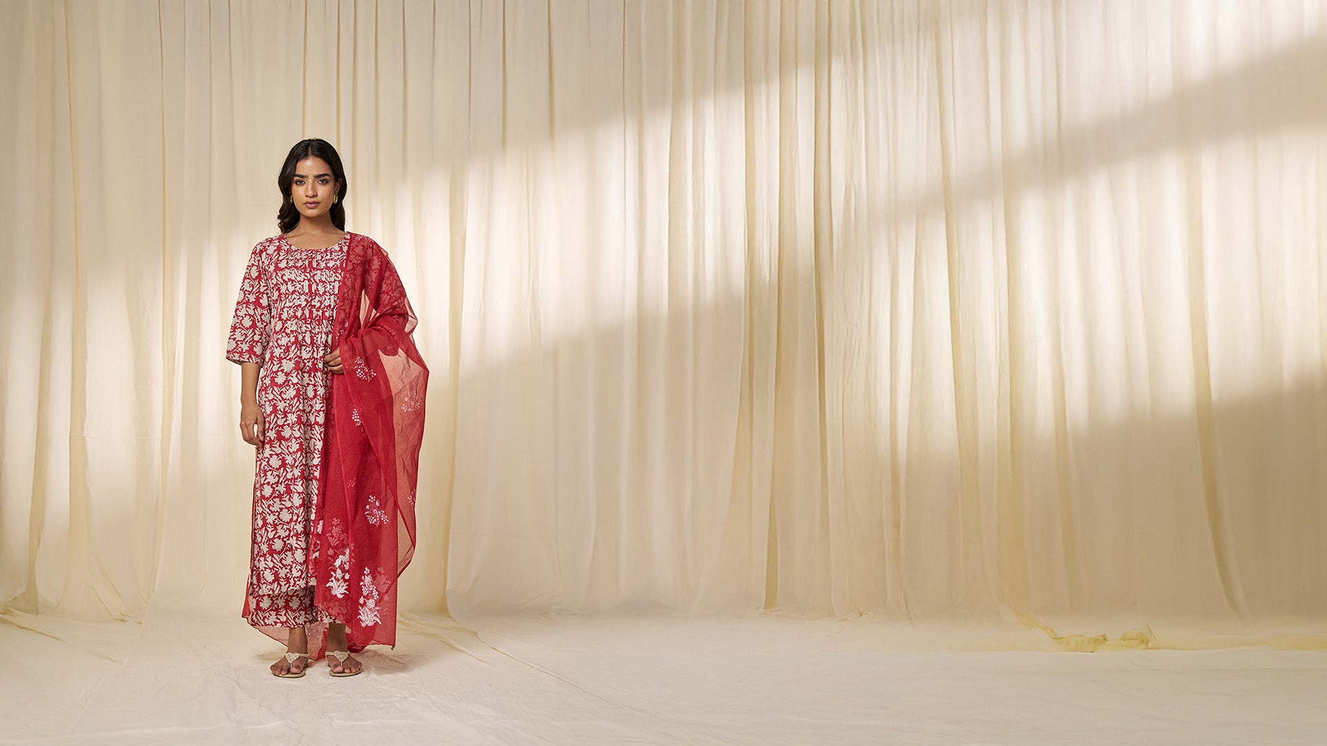 The dark red hand block printed cotton kurta features an all-over botanical pattern of repeating floral and leaf motifs linked by fine vines. The round neckline leads into a front yoke detailed with thin pleats. Designed in a fit-and-flare silhouette with panels add graceful flare from the waist down. It is finished with three-fourth sleeves for a balanced, elegant look.