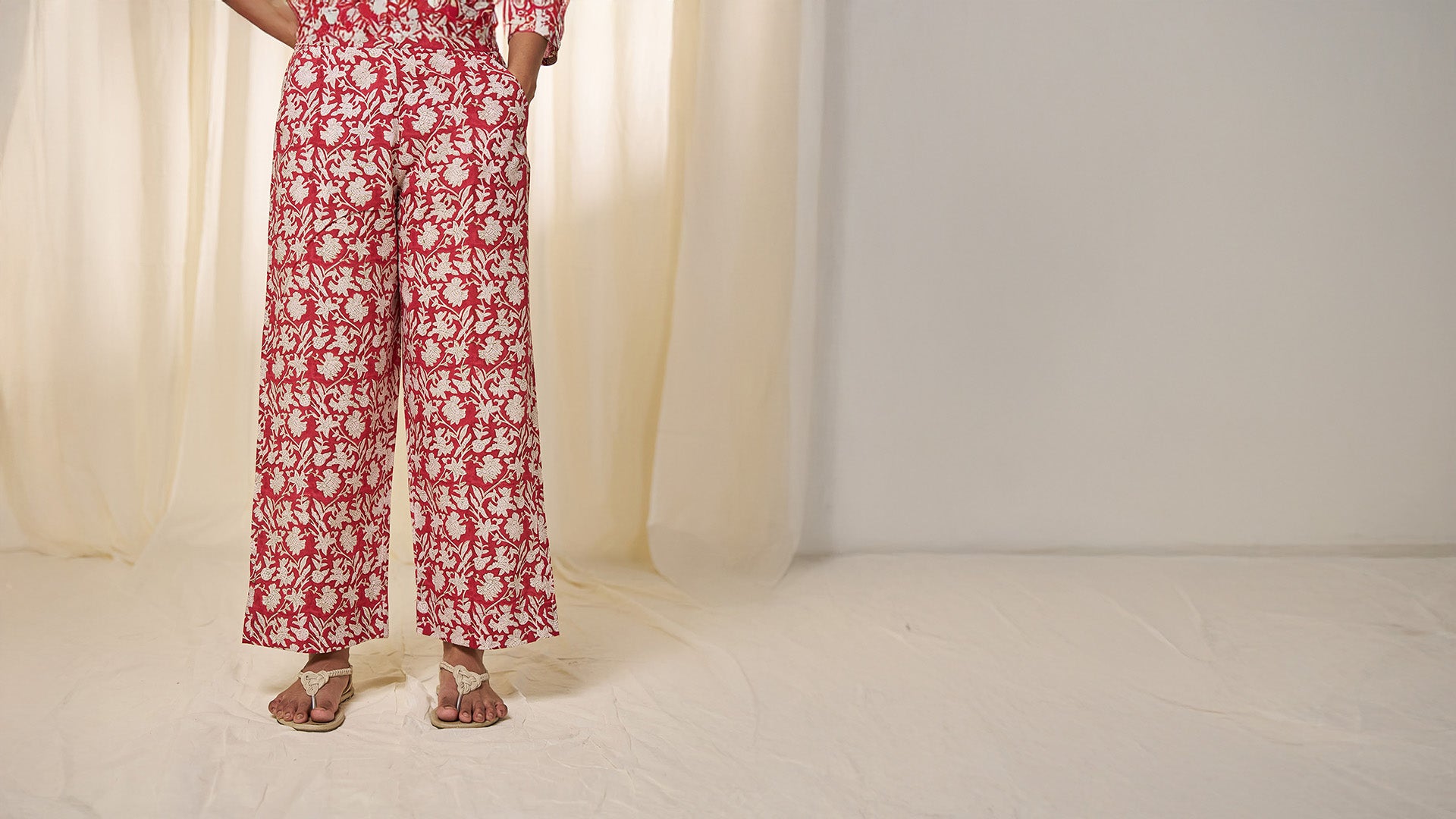 Hand block printed straight pants featuring an all-over botanical repeating pattern subtly highlighted with green for added depth and interest. They include two side pockets and a semi-elasticised waistband with a drawstring for an adjustable, easy fit.