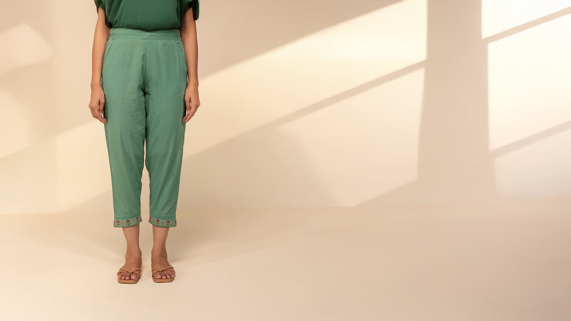 Tailored from soft voile, these straight green pants are detailed with hand block printed trims near the hem. Designed for ease and comfort, they feature two side pockets and a semi-elasticised waist with a drawstring finish.