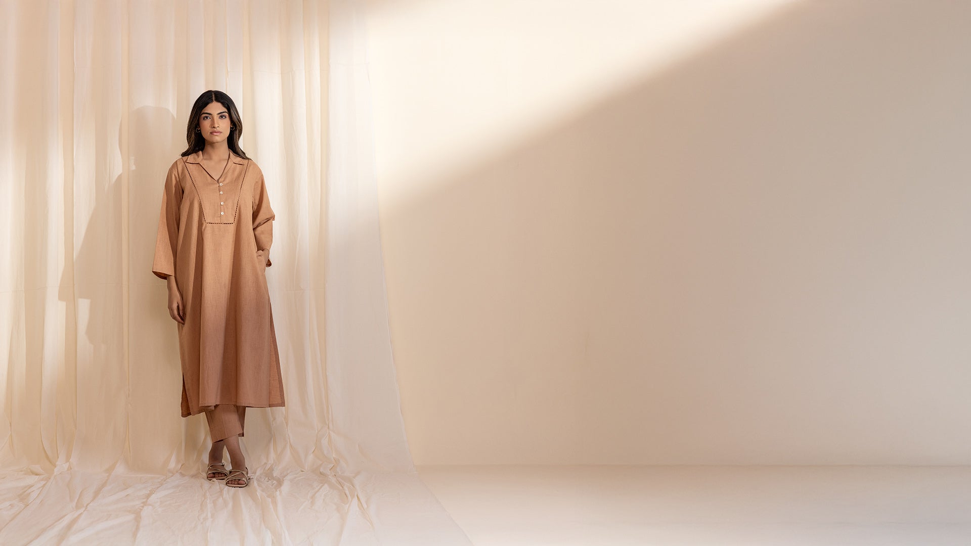 This relaxed fit cotton slub kurta in powder cinnamon features lattice lace detailing on the front yoke for added texture and charm. It has a collared V neckline with shell button embellishments along the placket and comes with two practical side pockets. A comfortable and versatile option for everyday wear.