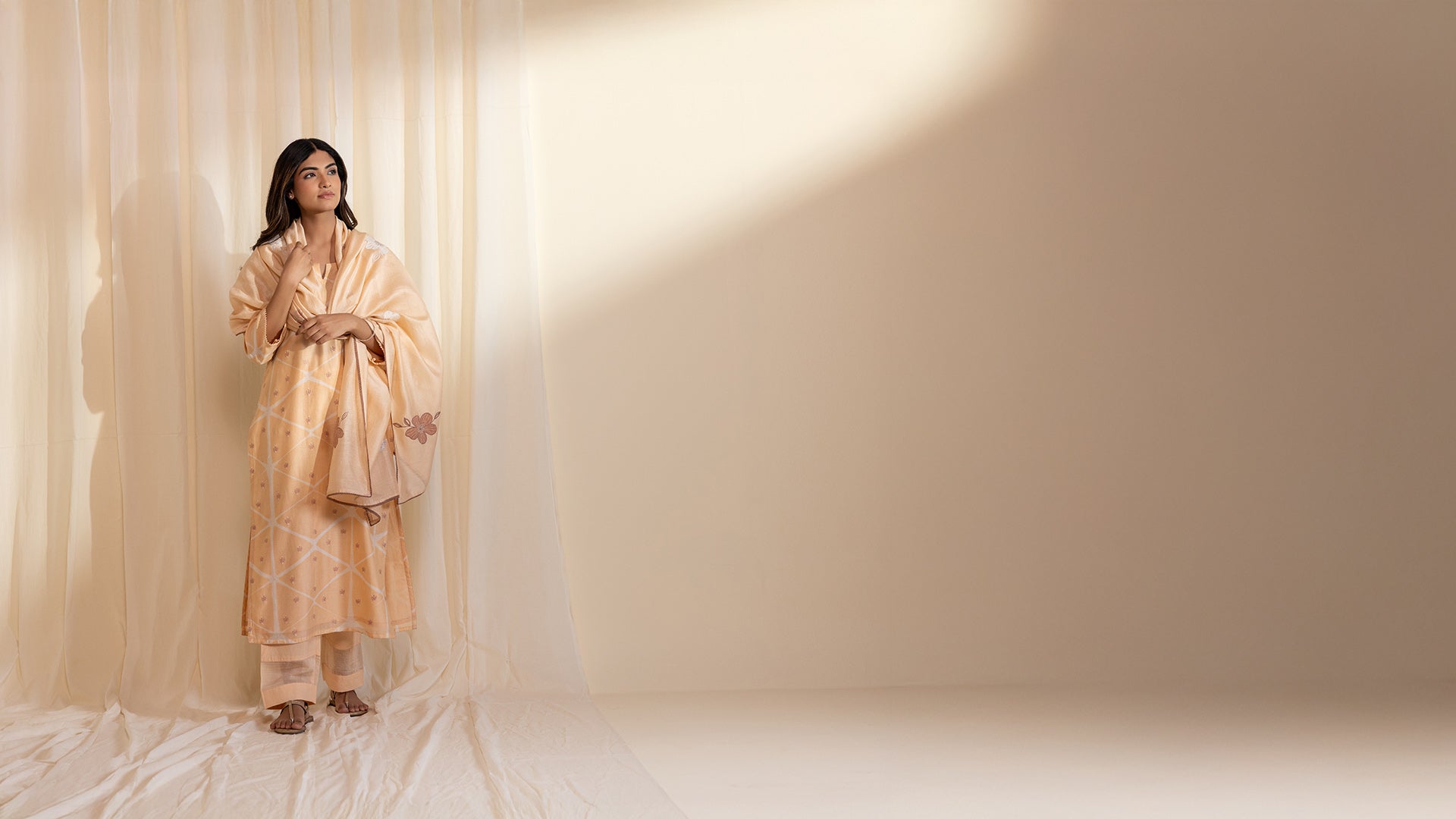 This uniquely crafted chanderi kurta in pastel peach stands out with its delicate star-like pattern created through traditional tie and dye. The front is further enhanced with fine floral embroidery, while crochet lace edging at the sleeve cuffs adds a graceful detail. Designed in a straight cut, it balances charm with subtle sophistication.