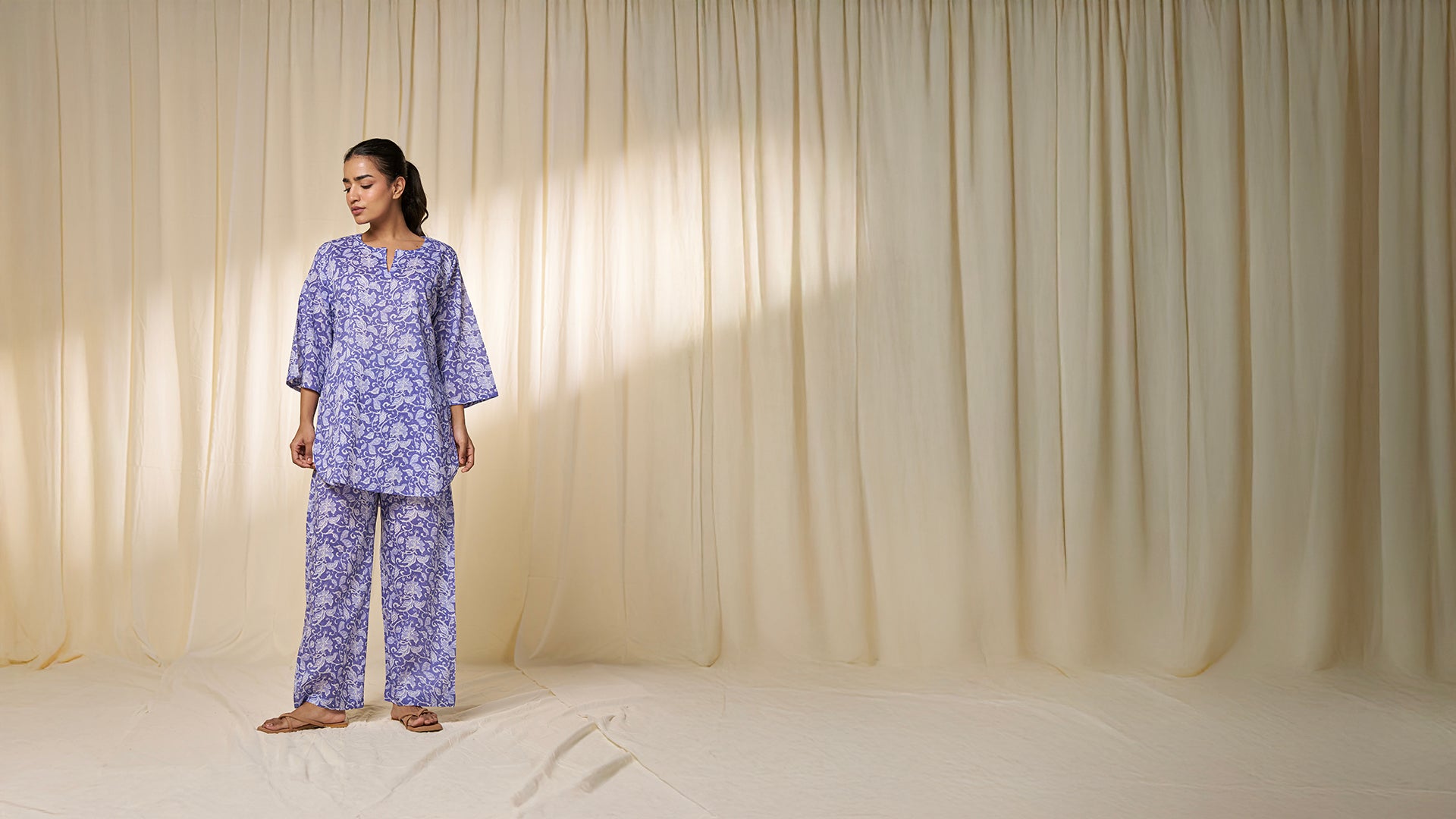 This grape night suit set features blue, white and purple floral and vine prints all over, with a split round neckline, rounded hem and wrist lenght sleeves. It comes with matching pajama pants featuring two side pockets and a semi-elasticised waistband with drawstring.