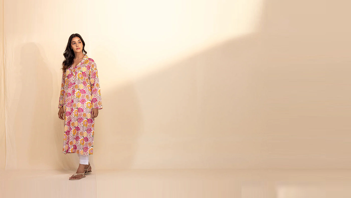 This soft white-based viscose kurta showcases a delicate floral print in vibrant shades of hot pink, maroon, mustard yellow, and green, exuding a feminine charm. Designed with a relaxed fit, a notched collar, full sleeves, and two side pockets, it combines effortless elegance with everyday functionality.