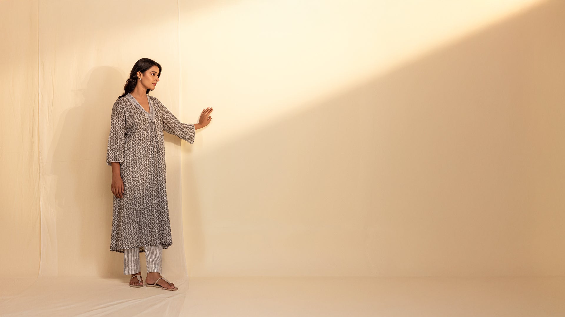 Elegantly hand-printed in smoky grey, this voile kurta features delicate floral motifs within a lattice pattern. A collared V-neckline with intricate embroidery, gentle gathers on the front yoke, and piped sleeve edges add refined charm.