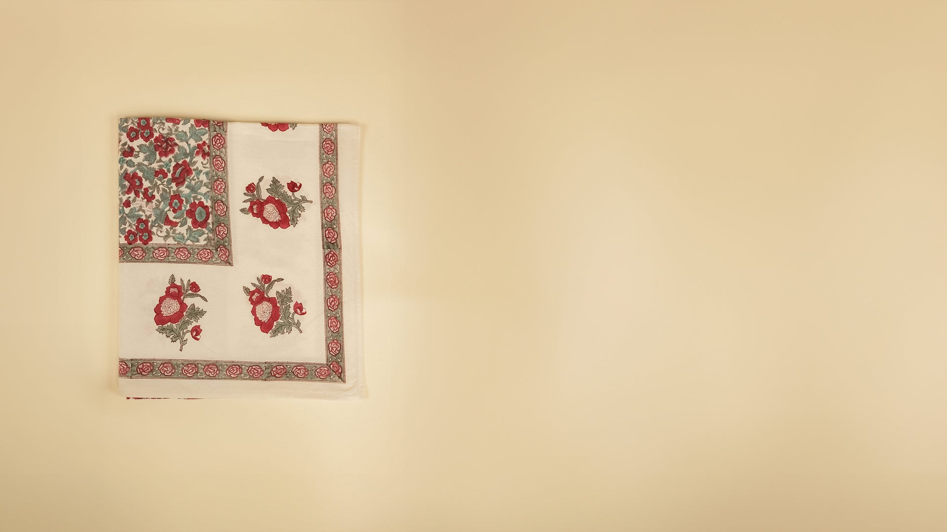 The Songbird Bed Cover features an intricate hand block printed design with red and green floral motifs and songbirds. It is adorned with a floral border and large floral patterns along the edges, adding elegance to your bedroom decor. Crafted from soft cotton, this bed cover brings the serene beauty of nature into your home.