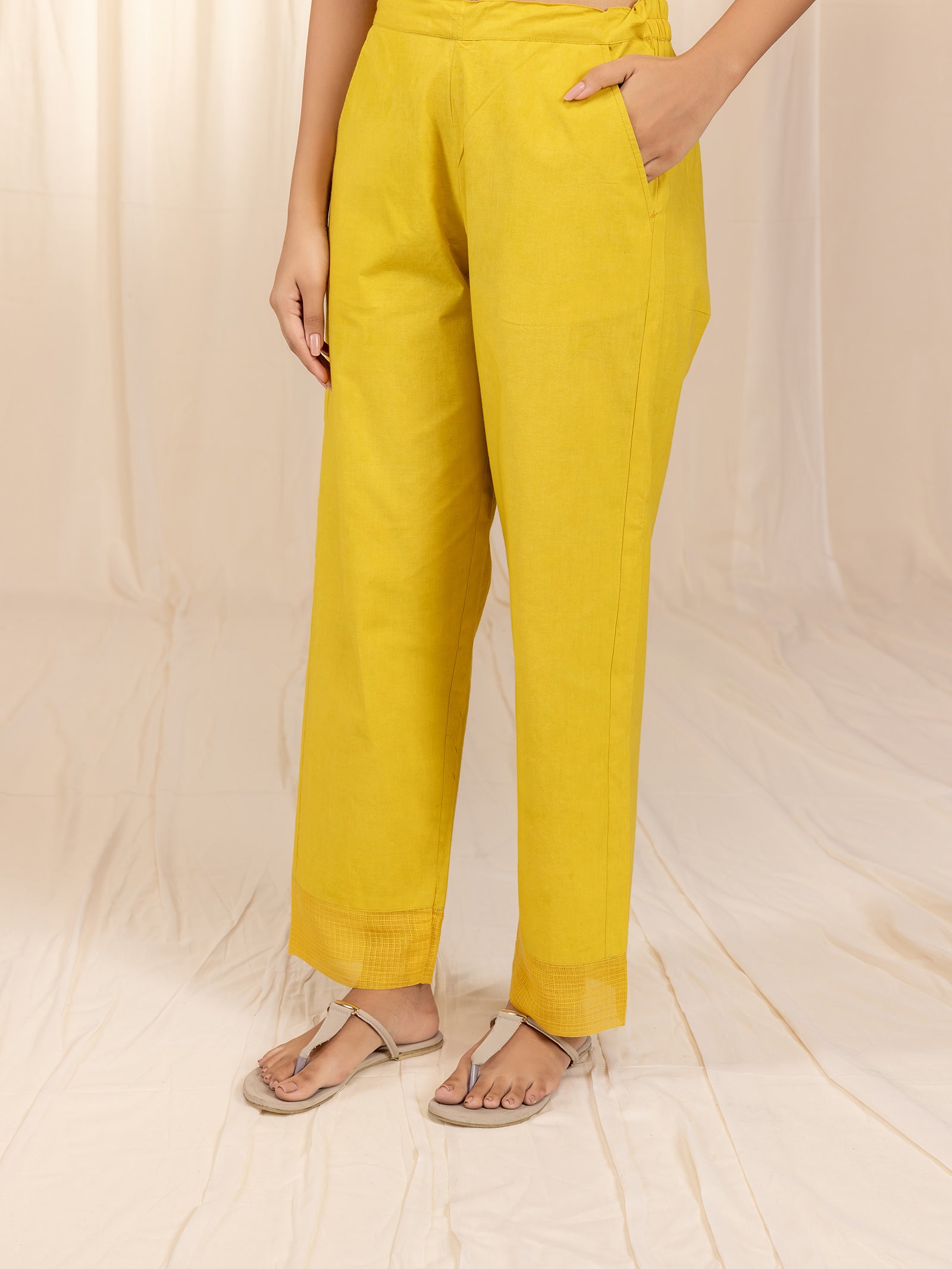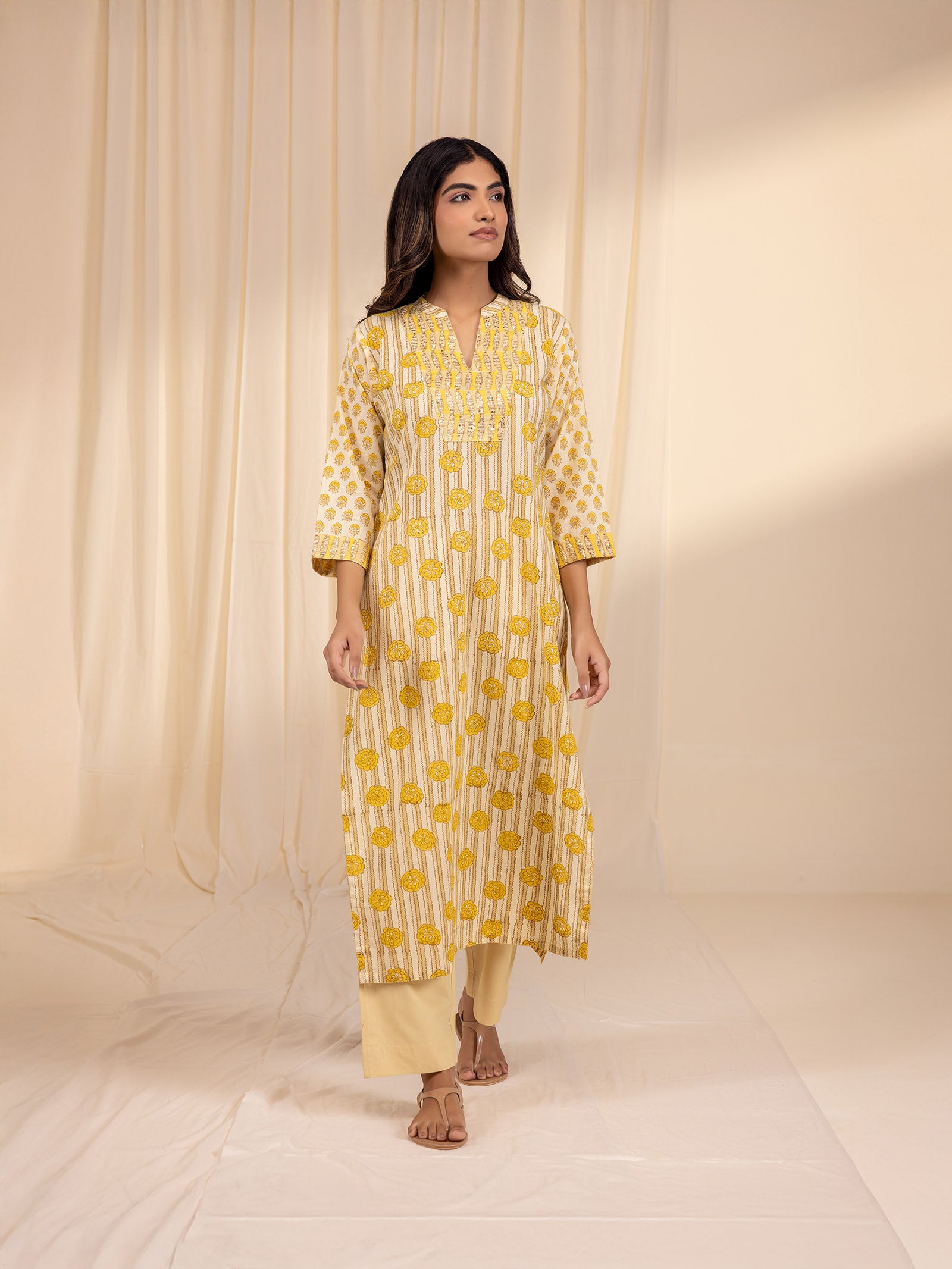 Clusters of peach roses printed across a mustard-yellow base cover this straight-cut kurta. The 3/4 sleeves and hem with finished with Kota Doria panels, edged with scallops, embroidered with roses and tiny dots. A delicate pom-pom lace trim completes the design, adding subtle texture and a refined finish suitable for day and festive wear.