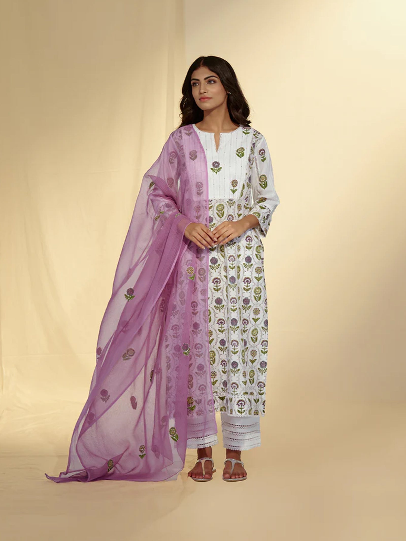 This light blue Kota Doria dupatta is adorned with printed borders and delicate crochet lace. Dainty white crochet flower appliqués add a charming touch.