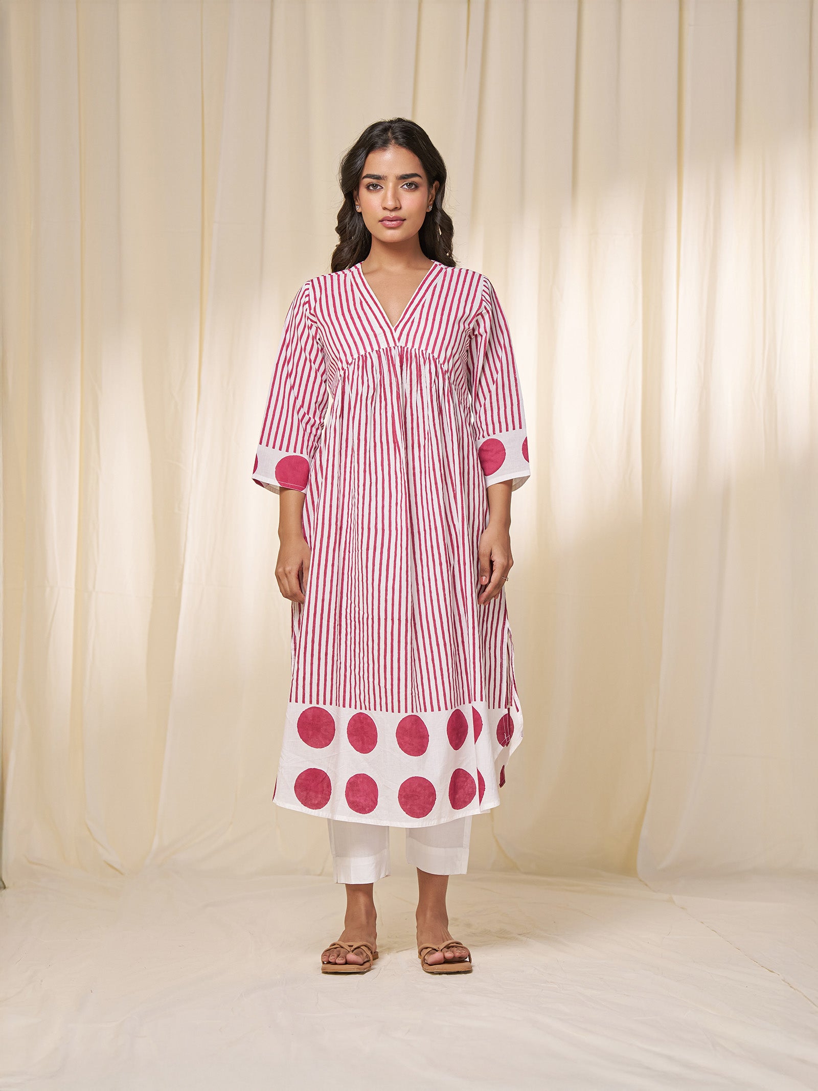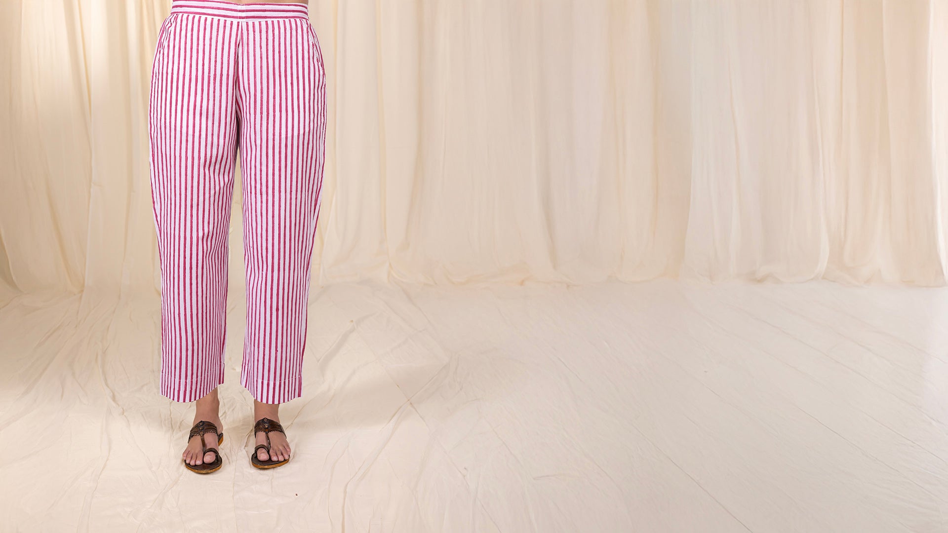 White cotton straight pants hand block printed with maroon stripes. Designed with two side pockets and a semi-elasticated drawstring waist for comfort and versatility.