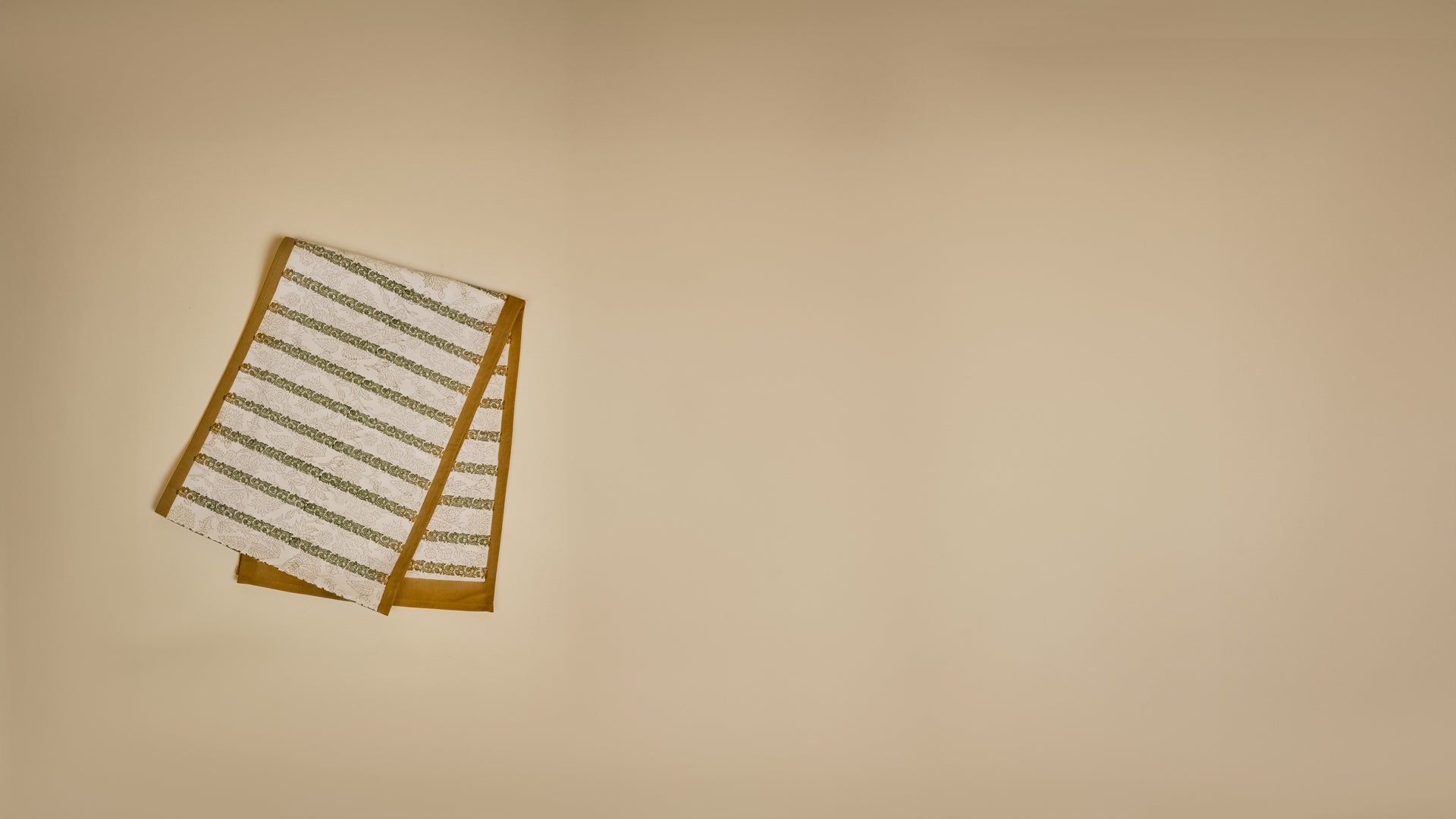 The Sunbaked Table Runner features a hand-block printed design with diagonal stripes in earthy tones of green and beige, set against a warm white background. Bordered in a rich mustard colour, this cotton runner adds a touch of warmth and elegance to your dining table.