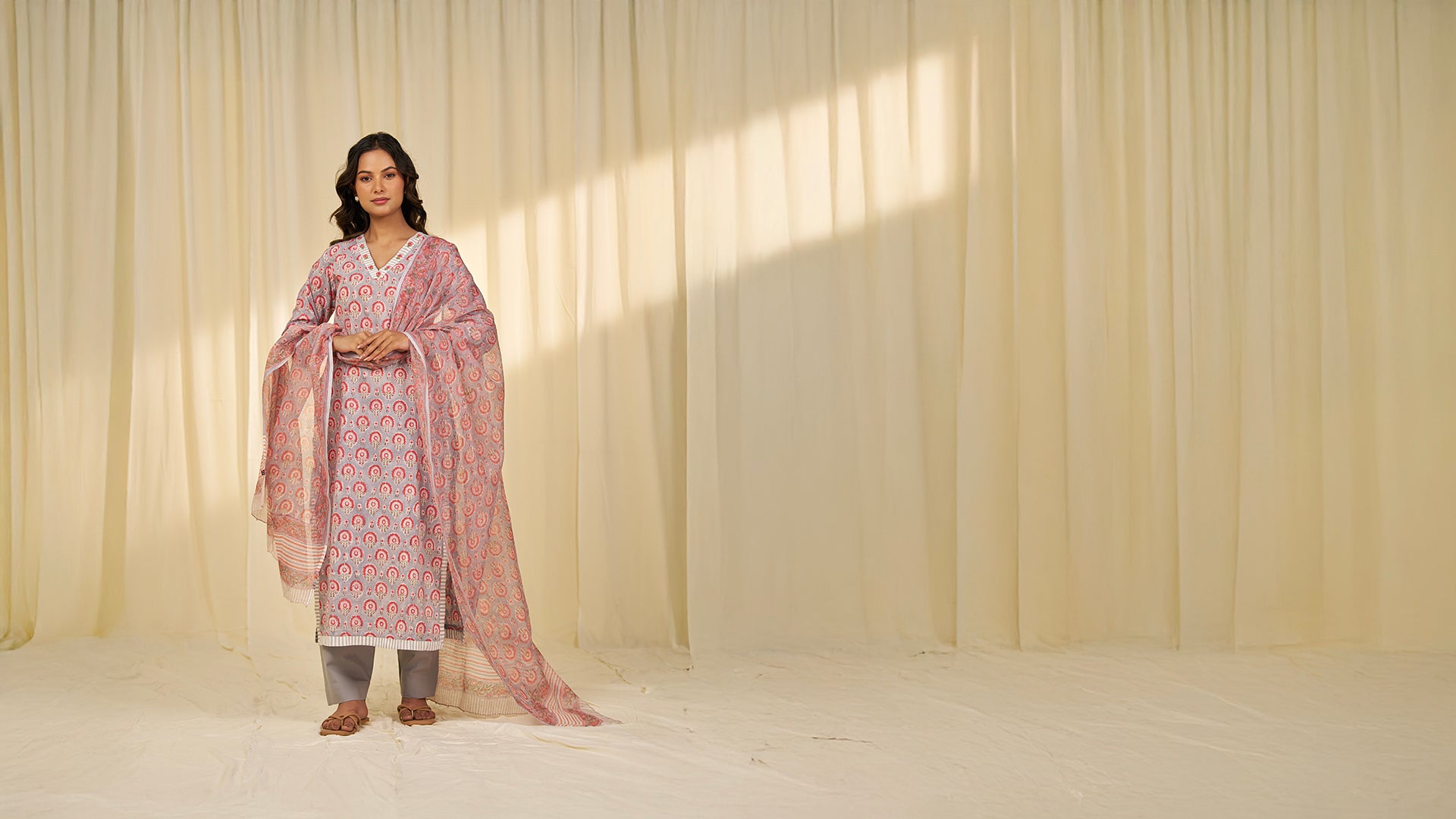 This straight cut stone-grey kurta is hand block printed with peach floral motifs. Featuring striped fabric detailing on the V-neckline, 3/4 sleeve hems, and kurta hem. The back yoke is accented with dash embroidery and a statement floral appliqué.