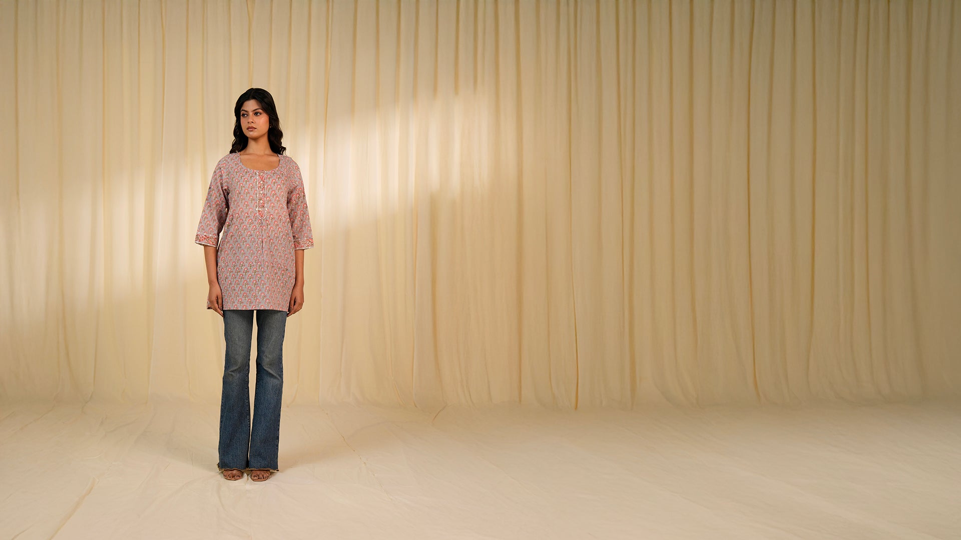 This light grey cotton kurti is hand block printed with peach flowers and green leaf motifs. It is designed with a front open round neckline, detailed with shell buttons and piping along the placket. It's finished with two side pockets and three-quarter sleeves with floral borders and piping.