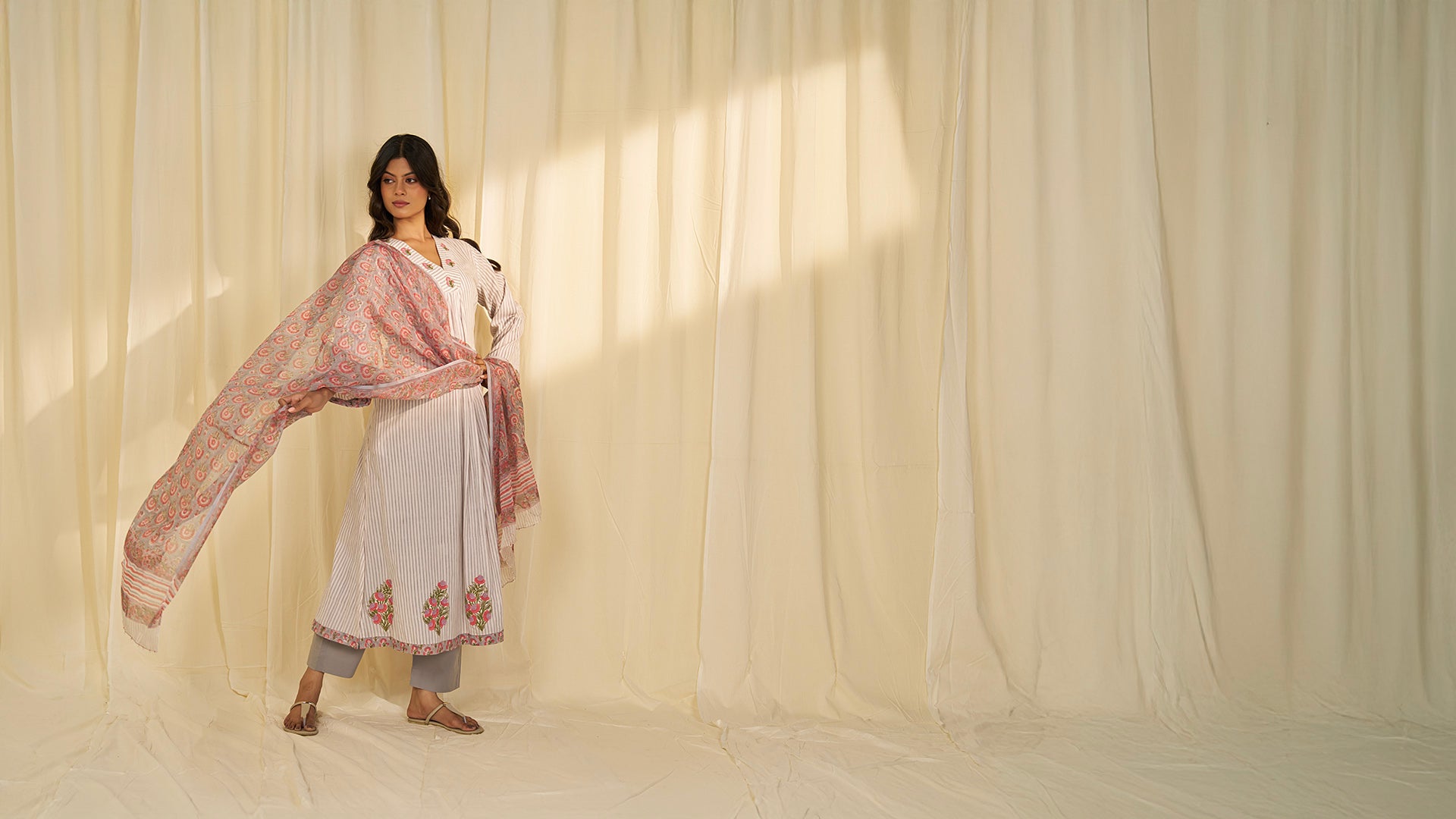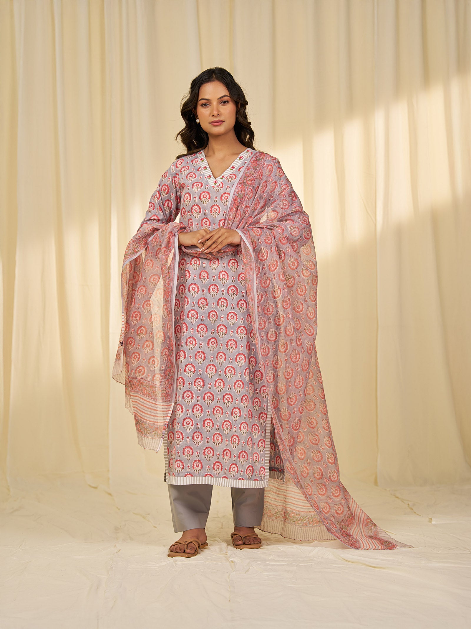 This stone grey Kota Doria dupatta with hand-block printed peach floral motifs across the central body is detailed with intricate floral borders and finished with delicate glass bead tassels on both ends.