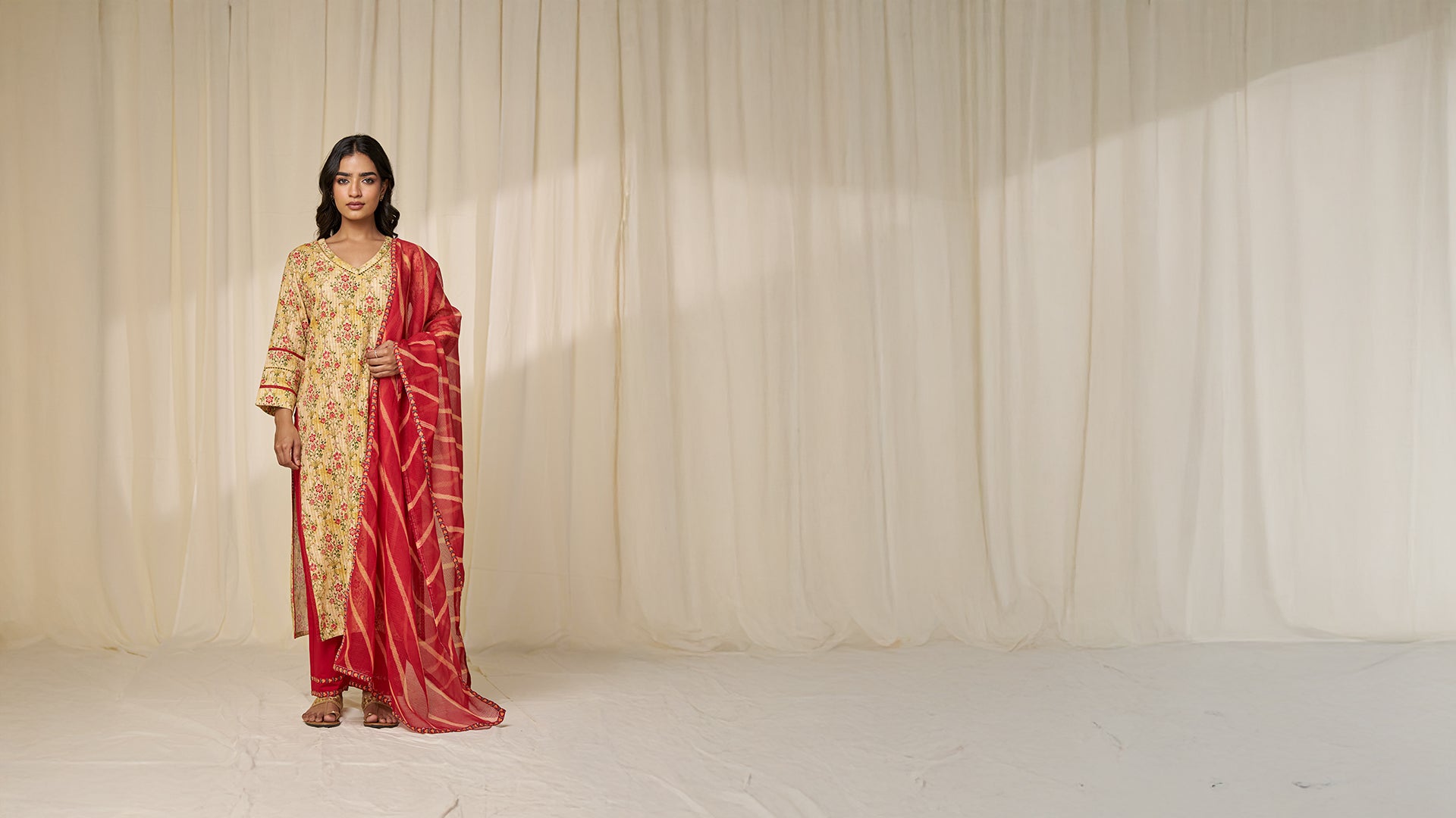 Yellow self-design dobby cotton straight cut kurta featuring ornate floral motifs in shades of red and green that create a striking contrast and beautifully highlight the red blooms against the yellow base. Intricate crochet lace frames the kurta on all sides, adding refined detailing.