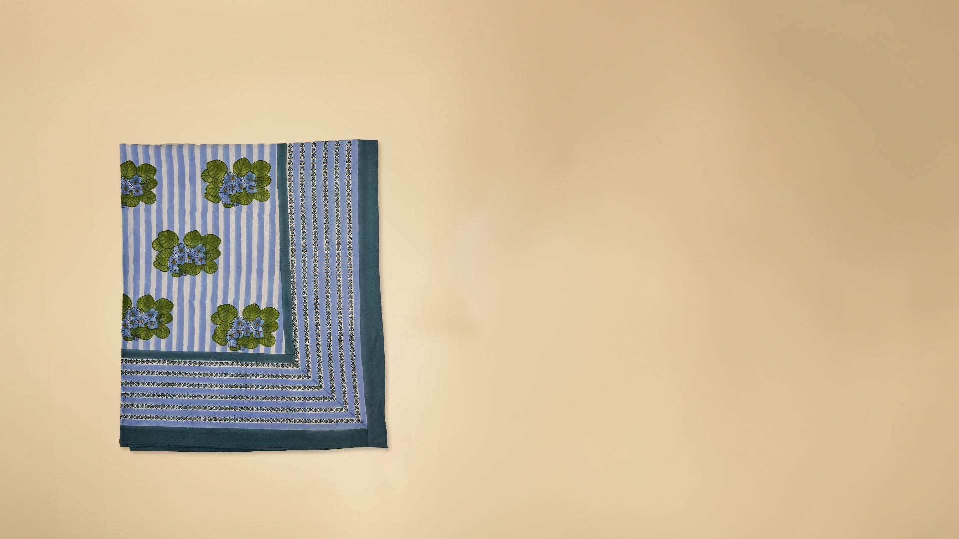 The Suvasa Botanicals Bed Cover draws inspiration from the timeless beauty of botanical illustrations. Hand-block printed in shades of periwinkle blue and leafy greens, it features hydrangeas printed on blue stripes with a stripped border.