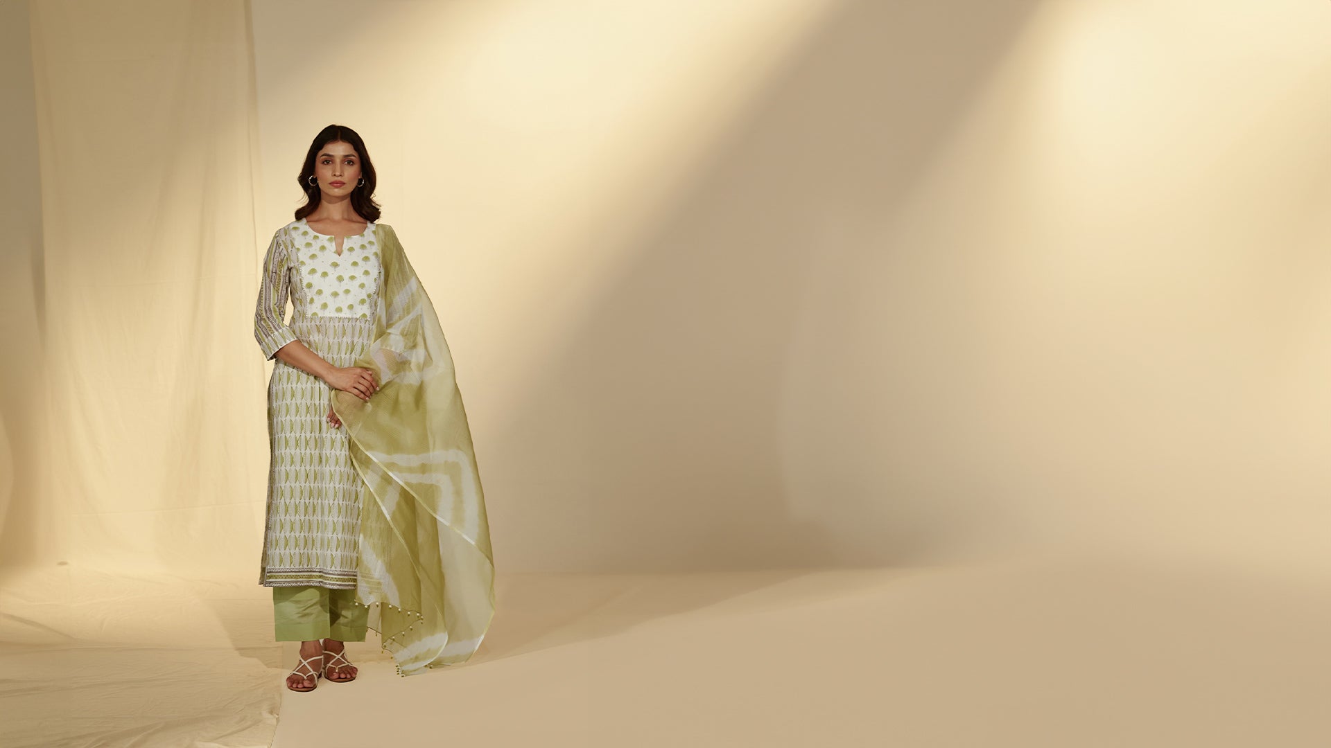 This lightweight Kota Doria cotton dupatta features a soothing tea green tone in a striking tie-dye pattern. The soft, airy fabric is embellished with delicate beads and pearls along the edges, adding a touch of elegance and refinement. A perfect complement to elevate both casual and formal outfits.