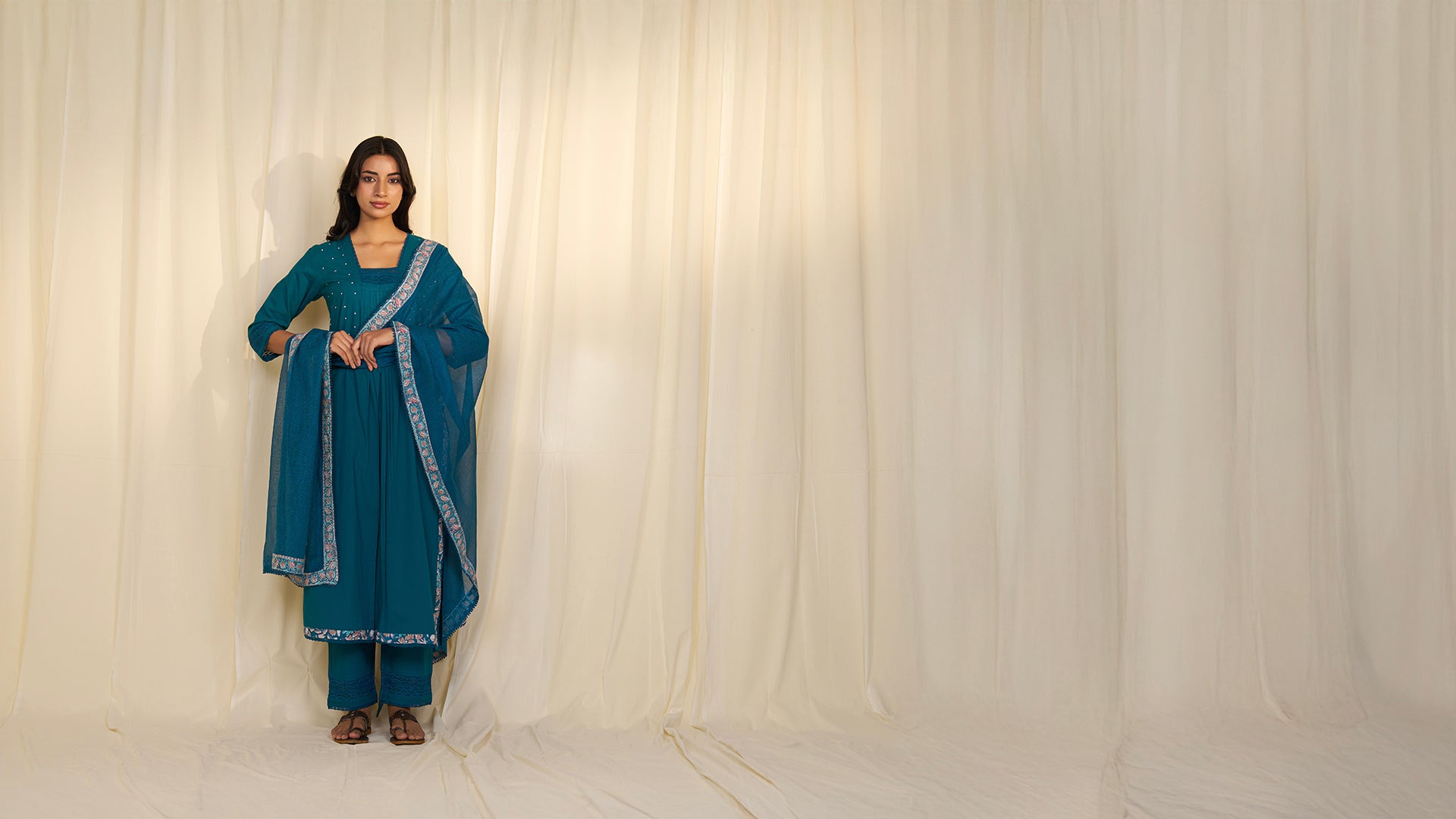 This dark teal kurta features thin knife pleats beneath a square lace neckline, creating a fit-and-flare silhouette. Tiny white silk thread dot embroidery on the bodice adds more detailing. The three-quarter sleeves are hemmed with matching crochet lace, while a border of printed floral fabric frames the side slits and hems of this kurta.