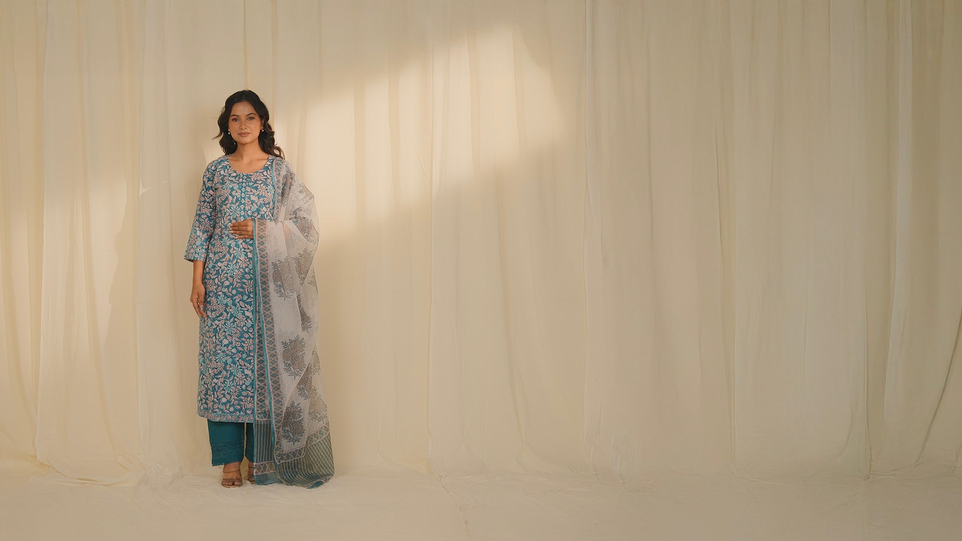 This simple straight-cut kurta features a floral print of turquoise, white, and stone grey flowers on a teal base. A subtle contrast is offered by the floral vine print at the kurta hem and on the three quarter sleeve hems. The sleeves and placket beneath the round neckline are embellished with silver sequins and pearls for a little sparkle.
