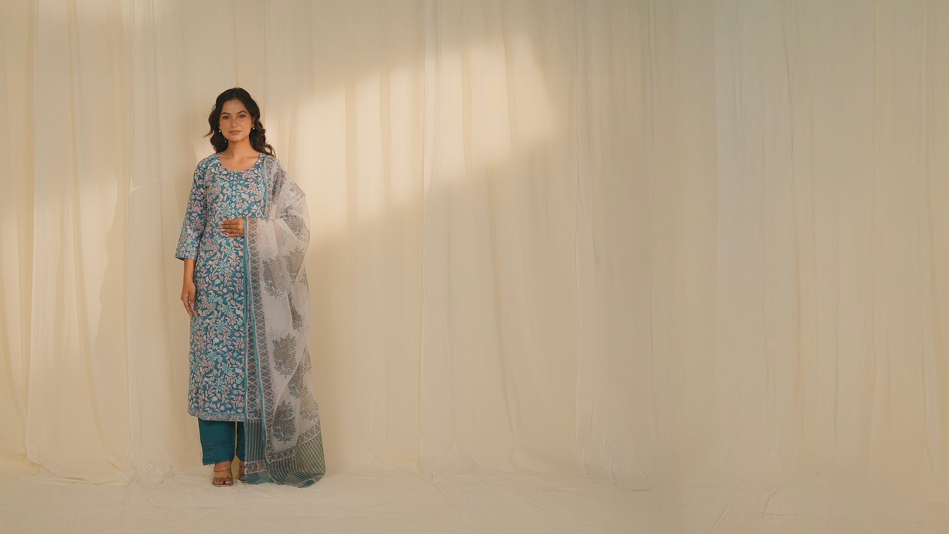 This hand block printed Kota Doria dupatta features repeating marigold flower motifs on a finely striped base. A diamond geometric pattern and thick teal border frames the dupatta. Both ends feature thick striped panels framed by the same diamond print and teal hem. Pearl and bead tassels add sparkle to each end. Paired kurta and pants can be bought separately.