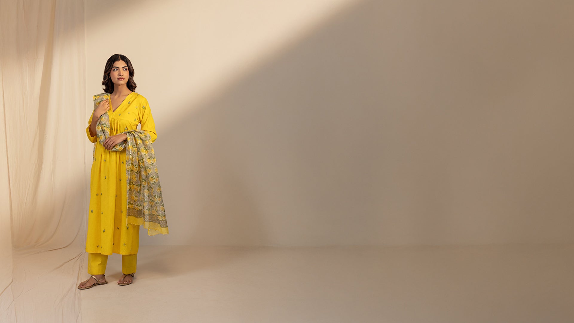 This charming Kota Doria dupatta features hand block prints in cheerful yellow, stone grey, and leaf green. Delicate bead embellishments along the edges add a graceful finishing touch.