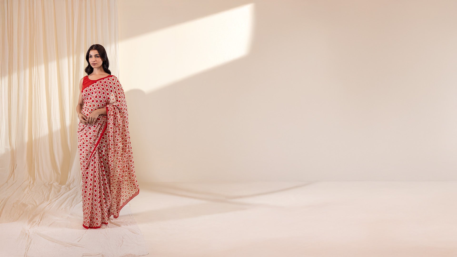 This elegant chiffon saree showcases a concentric circle print in red and beige. Golden gota-patti detailing adds a subtle glimmer, enhancing its appeal. It comes with a crepe blouse piece.